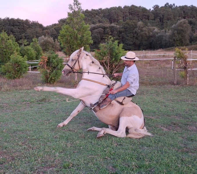 Verkauft wird eine wundervolle Stute mit Pía-Farbe, eingeritten, mit außergewöhnlichem Charakter. Kreuzung aus spanischem und lusitanischem Blut. Zudem steht ein neugeborener Fohlen mit Pía-Farbe zum Verkauf. Es handelt sich um besondere Exemplare, Fotos des Vaters mit Pía-Farbe und Perlmutt-Schimmer sind vorhanden.
