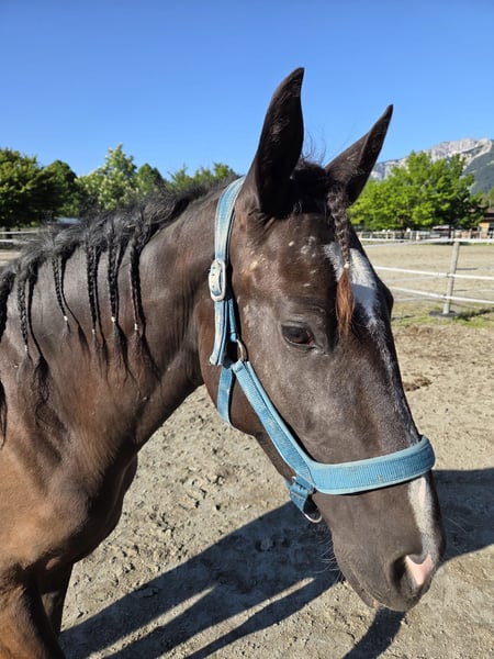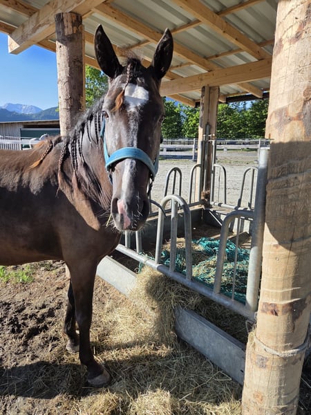 The nearly 3-year-old Cruzado cross mare, Valea (approx. 154 cm), is truly a heart stealer – affectionate, open, curious, and especially people-oriented. This lovely young lady consistently shows herself to be friendly and attentive, and as is typical for a young horse, she can sometimes be a bit cheeky and spirited – but that only adds to her charming personality. Valea is already familiar with basic foal training and impresses us with her absolute confidence in the field. Currently, she is learning new things during groundwork and is gaining her first positive experiences with saddle and bridle – she always remains calm, patient, and eager to learn. She is an absolute diamond in the rough and is looking for a sensitive handler who understands her needs and has experience in training young horses. Unfortunately, the young mare struggles with sweet itch during the warmer months, so a higher-altitude stable without standing water and without fruit trees would be ideal. Her ideal owner should have experience with eczema, especially summer eczema. Otherwise, she is in excellent health, fully vaccinated, microchipped, and ready to explore the world alongside her human. Valea is also very easygoing and compatible with other horses. She tends to be lower in the herd hierarchy and would thrive in a mixed herd with many friends to play with.