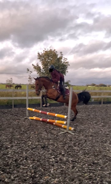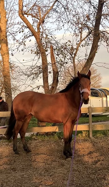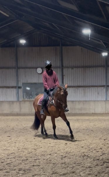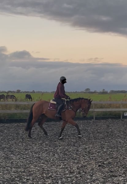 Ellie Merrie Cruzado Ca. 1.55m Ellie is een super lieve spaanse merrie van ongeveer 4 jaar oud, ze komt uit Spanje maar daar weten we verder niks van, in de bak is ze braaf en fijn voorwaarts maar nog wat ongebalanceerd. Op buitenrit is ze ook super braaf en heeft ze ook geen last van autos/vrachtwagens/brommers etc. Ik heb ook met haar gesprongen maar niet al te hoog, dit vind ze ook leuk maar heeft ze wel vertrouwen nodig. Ze is zeker geschikt voor de sport maar daarnaast wil ik ook een 5⭐ huisje voor haar. Vanwege haar leeftijd en ervaring niet geschikt voor beginnende ruiters Voor meer informatie graag contact opnemen met 0620054306, handelaren of maneges hoeven niet te reageren. Ze staat in Groningen