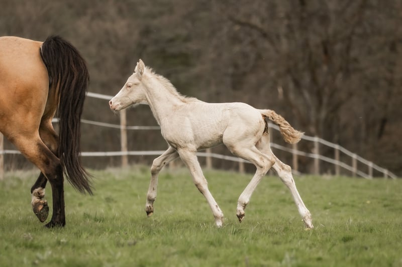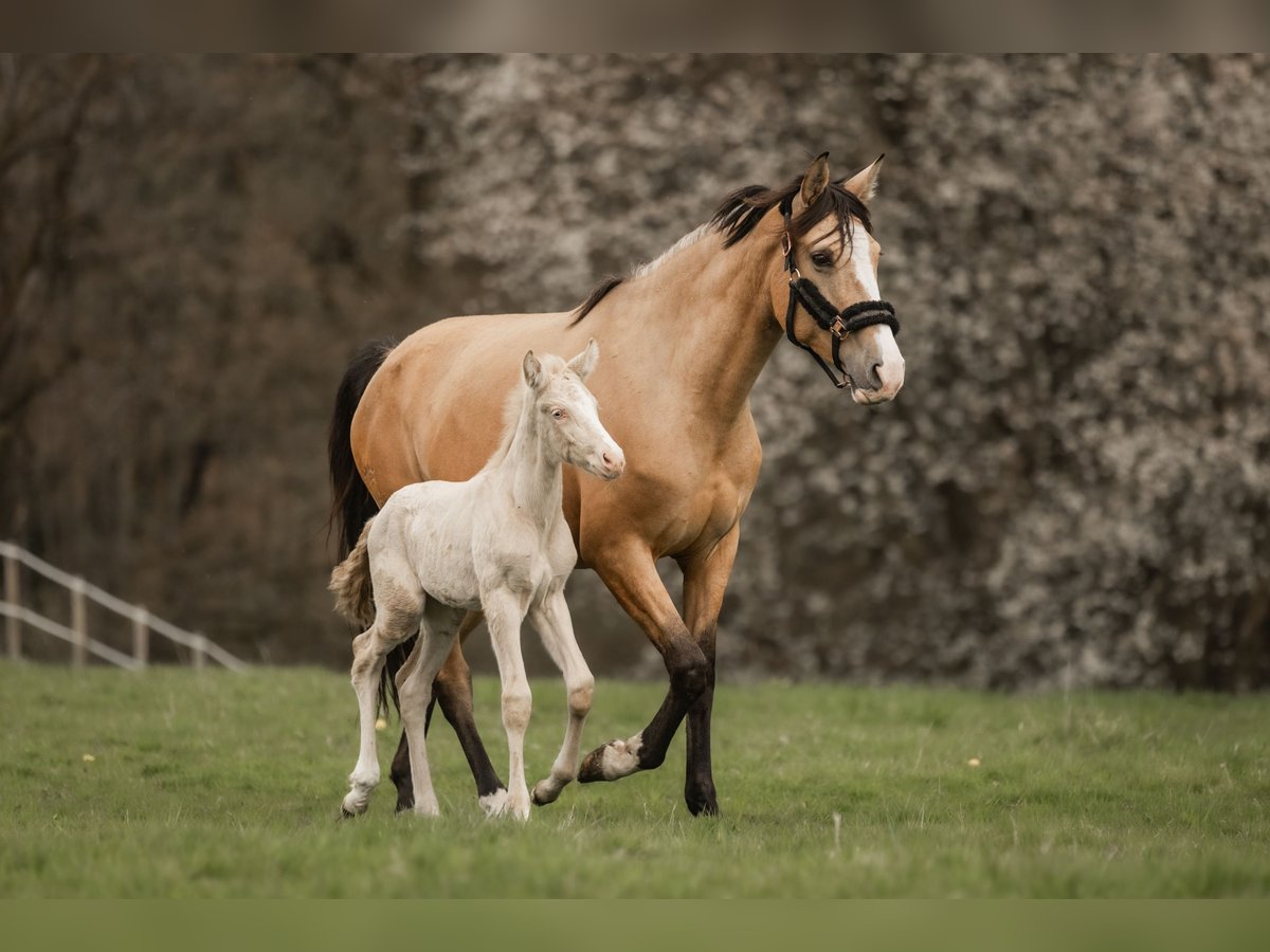 This young Cruzado mare, born in March 2021, impresses with her exceptional presence and striking appearance. Standing approximately 1.60 meters tall, she is a true one-of-a-kind due to her color combined with a large, distinctive blaze. Together with her Cremello colt foal born on April 7th, 2026, who has excellent movement, she is seeking a new home. Gisele is still untrained and has been gently introduced to the life of a future riding horse step by step, with patience and calmness before her birth. She is very sweet, cooperative, and human-oriented. She approaches new experiences attentively and cautiously. Her eagerness to learn and her honest character show daily progress, which she has also passed on to her foal. Both are genuine unpolished gems in a special color with great potential. For daily turnout, Gisele is accustomed to going out to the paddock and relaxes peacefully within the herd there. She has been regularly presented to the farrier and is currently barefoot. They are located in 53578 Windhagen-Rederscheid. If you are interested or have any questions, we look forward to hearing from you. Additional pictures and videos can be sent via WhatsApp at +49 1590 1725817. A personal visit is almost always possible. Of course, there is also the option to arrange for her to be transported directly to her new home.