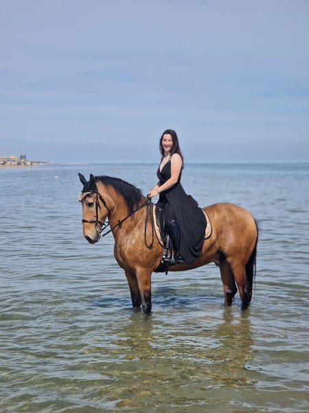 For sale: 11-year-old Spanish crossbred gelding, buckskin, due to lack of time. Excellent rideability (shoulder-in, haunches-in, leg-yield, rein-back, and flying changes), as shown in the photos. He is accustomed to competitions and trail riding in company. Suitable for intermediate riders. Spanish documents as a Cruzado. For more information, please contact me via WhatsApp at +34 3312286687. No time-wasters, no beginners.