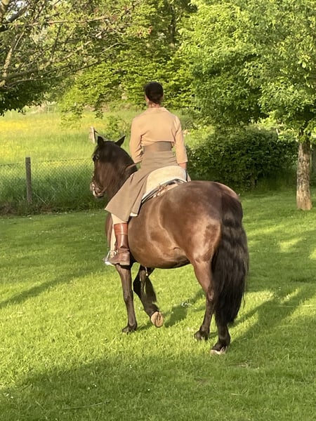 Montenegro (18 Jahre, 1.53m, Cruzado, castaño, grüner Paß) Er ist ein absolutes Freizeitreitertraumpferd. Er macht einfach alles mit und ist dabei immer tiefenentspannt aber nicht langweilig. Spaniertypisch sehr bequem zu sitzen. Bei uns zeigt er sich als geduldiger Lehrer für Anfänger, sehr lieb mit ängstlichen Reitern und voller positiver Energier mit mir (alter Hase seit 50 Jahren im Sattel). Er ist stellt sich auf den jeweiligen Menschen ein und ist immer dabei, wenn es darum geht Neues zu erarbeiten/entdecken. Ob Ausritte, alleine oder in der Gruppe, Schlitten ziehen, Working Equitation, Garrocha, Coolnesstraining, Handarbeit, berittenes Bogenschiessen, Trail/Extremtrail, Lektionen unter dem Sattel. Wir hatten fleißig Unterricht. Er ist sehr vielseitig ausgebildet und ganz fein an den Hilfen. Man hat nur das Gewicht des Zügelleders in der Hand, fein am Bein und Gewicht, Stimmhilfen und Körpersprache. Er wird derzeit einhändig im Bosal oder Kandare gearbeitet und macht richtig Spaß. Er geht auch sehr schön in der Portugiesiscshen Kandare (4-zügelig). Er ist von der ruhigen besonnen Sorte aber keine Schlaftablette. Weder triebig noch eine Rennsemmel. Kann sich sehr gut konzentrieren, verzeiht Fehler. Kennt alles was ein lebendiges Dorfleben zu bieten hat. Kühe, Schafe, Enten Hunde, große Maschinen uvm. auch Boxenhaltung, Offenstall, Heuraufen und -netze, Führanlagen, Reitplätze, Hallen usw. Bleibt selbst bei herannahenden Drohnen cool. Geht über Brücken, Gitterroste und auch schmale Wege. Kennt es im Hänger zu einem Training zu fahren. Sowohl über Nacht als auch für eine Einheit. Meinen Traum im Damensattel zu reiten würde er sicherlich, ohne mit der Wimper zu zucken, mitmachen. Unkompliziert, hat ein riesengroßes Herz, menschenbezogen und ein Genießer. Liebt die Masterson Methode. Ein Schatz auf vier Hufen mit besten Manieren nicht nur unter dem Sattel, sondern auch im täglichen Umgang. Und wenn man Lust auf einen flotten Galopp hat kann man anschließend einfach die Zügel lang lassen und gemütlich dahinschländern. Tierarzt, Zahnarzt, Schmied, Hänger fahren usw. macht er ganz locker. Ich suche schweren Herzens ein passenderes Zuhause für ihn nur aus einem Grund. Nach Jahren als Einstaller halten wir unsere zwei Pferde Zuhause in Eigenregie. In den Ställen bekamen sie zu viel Futter, was sie nicht vertragen. Er bekam EMS. Hier bei uns kann ich nicht die Umgebung schaffen die für ihn funktionieren würde. Er liebt es mit anderen Wallachen zu spielen. Unsere Stute spiel nicht mit ihm. Es fehlen ihm Bewegungsanreize und leider sind unsere Weiden sehr fett. Er ist Checkheft gepflegt und gesund bis auf EMS. Er ist nie krank und verletzt sich nie, hat keine Allergien oder sonstiges. Ist Barhufer mit Hufschuhen. Es gibt natürlich noch viel mehr zu erzählen, daß dann gerne bei ☕️☕️ Montenegro lebt bei Aachen. Gerne darf ein entspanntes Kennenlernen über mehrere Besuche stattfinden ist jedoch kein Muss. Für Monte ist neben einer gesunden Ernährung viel Bewegung wichtig. Er bewegt sich sehr gerne. Weidegang mit Jungs zum Toben, Allwetterreitplatz oder Halle die ein ganzjähriges kontinuierliches Training ermöglichen, eine Führanlage wäre hilfreich. Wir haben diese Möglichkeiten leider nicht. Wer ernsthaftes Interesse hat darf mich gerne alles fragen.