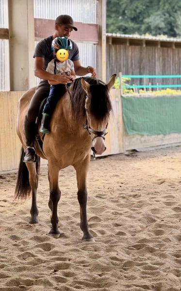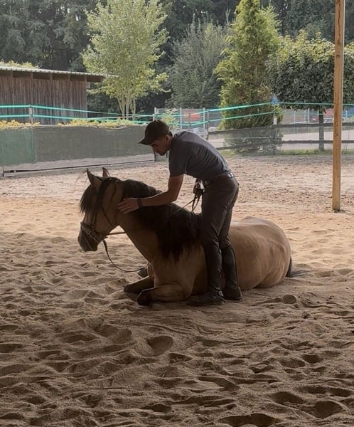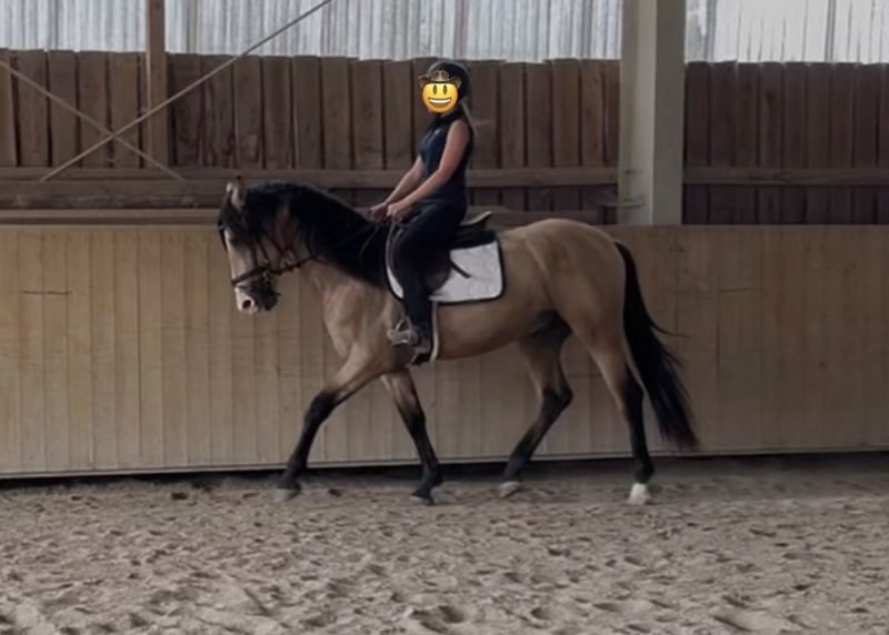 Zum Verkauf steht der 3,5 jährige Ca. 156 groß Andalusierwallach Artista. Optisch besticht er besonders mit seiner Farbe, seiner üppigen Mähne und vor allem seiner tollen Ausstrahlung. Auch charakterlich ist er ein absolutes Traumpferd. Er ist super lieb im Umgang, ausgeglichen und sehr menschenbezogen. Er wurde schonend angeritten, läuft in allen Gangarten brav sowohl in der Halle als auch im Gelände. Ausreiten kennt Artista alleine und in der Gruppe. Er zeigt sich dabei komplett unerschrocken und mutig, auf Neues geht er stets neugierig zu und hat keine Angst. Er ist absolut klar im Kopf und lässt sich nicht so leicht aus der Ruhe bringen. Dennoch hat er einen angenehmen Vorwärtsgang. Auch an der Longe und bei der Bodenarbeit beweist er, wie schnell er lernt und wie viel Spaß er an der Zusammenarbeit hat. Mit der Freiarbeit haben wir auch begonnen. Daran hat er viel Freude und orientiert sich sehr an seinem Menschen. Artista wurde auch bereits von Kindern an der Longe und frei in der Halle geritten und hat das super brav gemacht. Mit seiner Ausgeglichenheit, Lernbereitschaft und seinem ehrlichen Wesen bringt er die idealen Voraussetzungen als Freizeitpartner mit. Bei Interesse gerne melden, dann können weitere Fotos/ Videos gesendet werden oder ein Kennenlernen vereinbart werden.