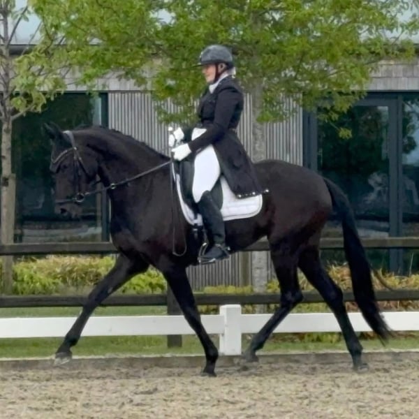 Gadee de Fontaine Wiek: 9 lat (urodzona w 2016 roku) Płeć: Klacz Ojciec: Grand Galaxy Win (od Apache) Matka ojca: Desperados FRH (od De Niro) Wzrost: 169 cm Wysokiej jakości klacz z doskonałym rodowodem, wspaniałym temperamentem oraz trzema chodami znacznie powyżej przeciętnej – szczególnie kłusem i galopem, które są naprawdę wyjątkowe! 💫 🏅 Wielokrotnie plasowała się na podium w konkursach na poziomie średnim w ujeżdżeniu 🏆 Startowała w para-ueżyżdżeniu z wynikami do 78% w kategorii Grade 3 💪 Obecnie pracuje nad piaffem, passage i zmianami piruetowymi w trójkach i dwójkach – rozpoczęte są już pierwsze zmiany pojedyncze Gadee to idealny koń dla Juniora, Młodego Jeźdźca lub U25, który szuka konia z potencjałem na najwyższe poziomy. Jest ujeżdżona, uczciwa i ambitna – codzienna praca z nią to prawdziwa przyjemność. Jej chodami wyróżnia się znacznie powyżej przeciętnej – szczególnie kłusem i galopem, które są wyjątkowe: mocne utrzymanie równowagi i doskonała technika czynią ją bardzo interesującym koniem sportowym. • W treningu na najwyższe ruchy: piaff, passage oraz zmiany piruetowe w trójkach i dwójkach – pierwsze zmiany pojedyncze są już rozpoczęte, co daje jej duży potencjał do osiągnięcia poziomu Grand Prix. ✨ Hodowla z mocą i osiągami: Ojciec: Grand Galaxy Win – champion DWB, koń od Apache, znany z elastycznego kłusa i mocnego galopu. Matka ojca: Desperados FRH – zwycięzca Olimpiady i Pucharu Świata, żyjąca legenda w międzynarodowym ujeżdżeniu. Została zatwierdzona w Danii w rodowodzie Warmblood (DV). Cena: 60 000 euro