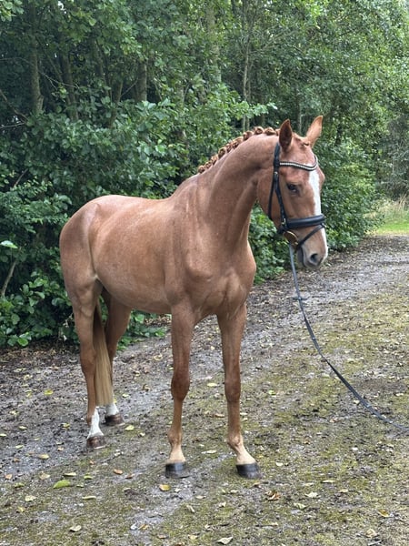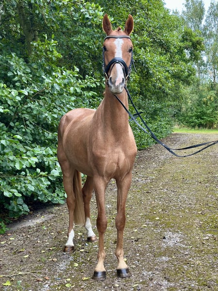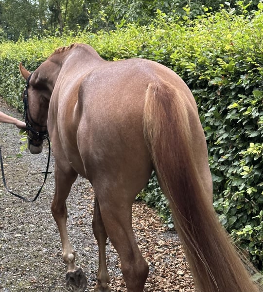 Specter is a promising and well-developed young horse with a fantastic temperament and a unique red coat with white ticking. He is well-balanced, seeks contact, and is relatively easy to handle in all situations, considering his age. He moves rhythmically, with elasticity, good energy, and forwardness – making him a clear prospect for future championships and sport. Specter was started under saddle by Mike Mihaita in the spring. Since then, he has had a growth break over the summer and has not been ridden since the initial backing. He was gelded in April. A 2-year-old brother by Highfive Fuglsang is also available for viewing. He has an impressive pedigree and comes from the successful "Engsøgaard line", bred by Danish breeding icons Knud and Margit Nielsen, Ølsted. Dam: Barilla was first presented for mare grading with Specter at foot in 2022. Barilla’s brother, Fürstenblick by Fürstenball, competed internationally in dressage under Anne Troensegaard in 2019 and 2020. He was later sold to Emilie Balling Nissen, a consistent member of the top tier of Danish youth dressage, who has represented Denmark at several international competitions. (Video of Anne and Fürstenblick is available.) Granddam: Bernadett by Bernstein, DVH 696, is a bronze medal mare (BRDH). Great-granddam: Barbara by Rambo, DVH 373, is an elite silver medal mare (ESRDH). She is also the dam of the bronze medal mare Brokade and the gold medal mare Bolivia. Great-great-granddam: Ballet by Waldstern, DE333330300280, is an elite mare (EDH). Ballet is the dam of the licensed stallion Barolo V, DVH 1048, and the elite mare Bolette V. Great-great-great-granddam: Bianca by Allegro, Hann314717172DH, is also an elite mare (EDS). You can explore more of his pedigree here (please note that as it is a German database, not all offspring may be registered): 🔗 https://horsetelex.de/horses/family/1511456 Specter is offered for sale directly by the breeder to the right home, who is looking to further educate a quality young horse with both talent and a good temperament. 📜 Pedigree on HorseTelex: https://www.horsetelex.com/horses/pedigree/2358046/specter-hkh Contact me on Whatsapp :)
