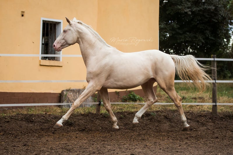 ZfdP (German Horse) | Cremello | Born 2015 | 17.3 hh Approved ZSSE / Book I, permanently approved by AES, Zangersheide Genetics: e/e A/A Cr/Cr This stallion impresses with outstanding movement quality and exceptional jumping ability under saddle. His bloodlines are top-class – all horses in his pedigree are licensed and performance-tested for life. His offspring can receive papers from at least KWPN, AES, Zangersheide, and Belgian Warmblood. In handling, he is exceptionally well-behaved and reliable. He is very friendly and easy to handle with mares and can cover naturally with safety and ease. A versatile, high-performance stallion with a strong character, excelling both in sport and breeding.
