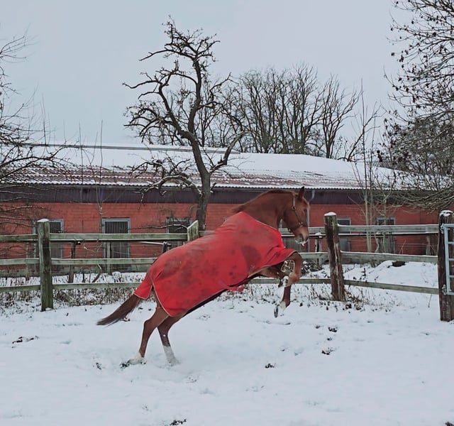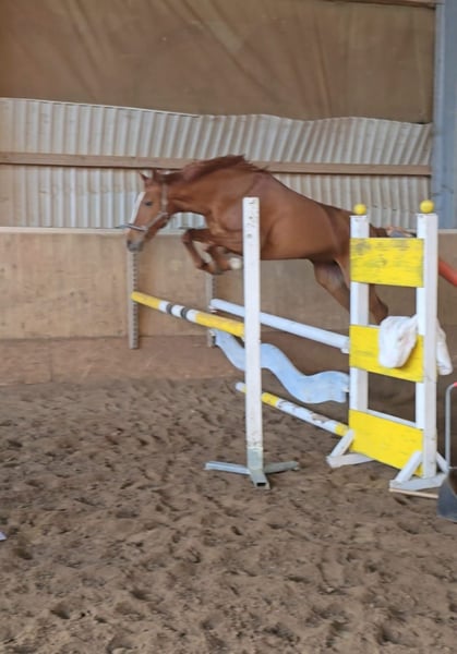 Casey ist eine 11 Jährige Fuchsstute und 161 cm groß. Ihre Abstammung ist leider nicht bekannt. In den letzten Jahren wurde sie Freizeitmäßig geritten, dabei zeigte sich, dass Casey konsequente Arbeit mit einem Reiter braucht, der über harmloses Testen hinweg reiten kann. Im Gelände hat sie etwas Go, bleibt aber händelbar. Seit einigen Wochen im professionellem Beritt wurde mit Stangenarbeit/Springen begonnen. Da zeigt Casey viel Freude und Talent. Ein aktueller TÜV liegt nicht vor, sie ist noch nicht als Turnierpferd eingetragen. Standort 32425 Minden Videos gerne per WhatsApp unter 0176-70349915