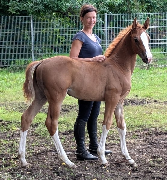 Diese sportlich gezogene junge Stute steht ab jetzt zum Verkauf. Easy S ist eine sehr ausdrucksstarke Stute,welche mit viel schick sich zu präsentieren weiß.Sie hat einen sehr elastischen Bewegungsablauf und dadurch 3 super Grundgangarten. Am 17.06.2025 ist sie geboren und wächst im kleinen Herdenverband auf. Das Aufhalftern,Führen und Hufe auskratzen gehört zum täglichen Programm.Sie ist eine sehr neugierige und aufgeweckte Stute und ist auch prämiert. Wir wünschen uns ein förderndes und gutes Zuhause,da diese Anpaarung auf eine sportliche Karriere hoffen lässt und wir als Züchter viel Herzblut in unsere Zucht stecken. Easy S Vater : Esmeraldo (Holsteiner Siegerhengst) Abstammend von Emerald van't Ruytershof x Caretino-Lord Ihre Mutter,Dalu (Staatsprämienstute Bild 7 und 8), ist siegreich bis Klasse M gelaufen und erhielt die Auszeichnung DSP Sport. Ihre 6 jährige Schwester von Comme il faut,konnte im letzten Jahr auch schon ihre ersten Platzierungen in den Springpferde A Prüfungen erreichen. Bei Fragen können sie gern Anrufen 0174 38 65 222