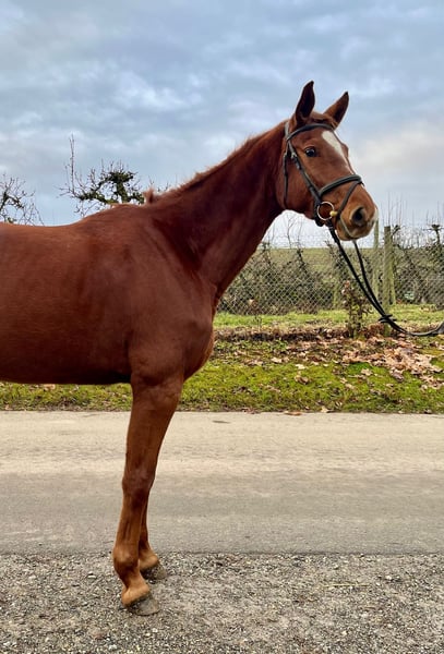 Large-framed German riding horse – Elegant chestnut mare, born 2022 For sale is a beautiful 3½-year-old German sport horse mare. With her striking chestnut coat and an impressive height of 17.7 hands, she is a true eye-catcher both visually and in terms of temperament. She demonstrates talent over fences and has three very good basic gaits. The mare is character-wise impeccable and possesses a pleasant, balanced demeanor, making her suitable for both ambitious leisure riders and competitive riders. She is also very interesting for breeding purposes. As a foal, she was awarded premium status and was reserve champion in the show jumping ring. X-ray images available! Due to a minor issue on the X-ray, she is offered at a significantly reduced price. Please feel free to contact me for further information or if you are interested.