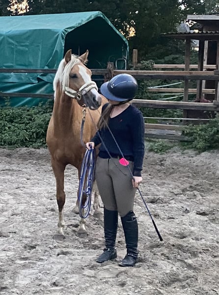 Corleon a une taille au garrot de 146 cm. Avec sa magnifique robe palomino, il est vraiment un attrait. Ce hongre a le potentiel de devenir un excellent poney pour enfants en dressage. Avec sa nature douce et son excellente attitude, il apportera beaucoup de joie à sa nouvelle famille. Il est bien socialisé, amical dans ses interactions et a un caractère équilibré. Il a été élevé dans les magnifiques prairies de la ferme équestre Buchenhof. Corleon est très bien éduqué et connaît déjà des exercices légers en main. Si vous êtes intéressé ou pour plus d'informations, veuillez me contacter. N'hésitez pas à venir nous rendre visite et à rencontrer ce superbe hongre en personne !