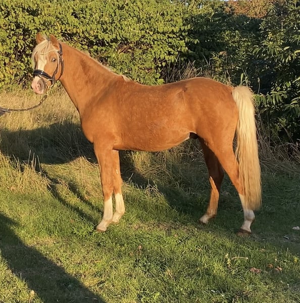 Corleon has a height of 146 cm at the withers. With his radiant palomino coloring, he is a true eye-catcher. This stallion has the potential to develop into a fantastic children's pony in dressage, and with his gentle nature and great attitude, he will bring much joy to his new family. He is well-socialized, friendly in handling, and has a balanced character. He has been beautifully raised on the marsh pastures of the Buchenhof stud. Corleon is very well-mannered and is already familiar with light work on the ground. If you are interested or would like more information, please contact me. Feel free to visit us and get to know this wonderful stallion in person!