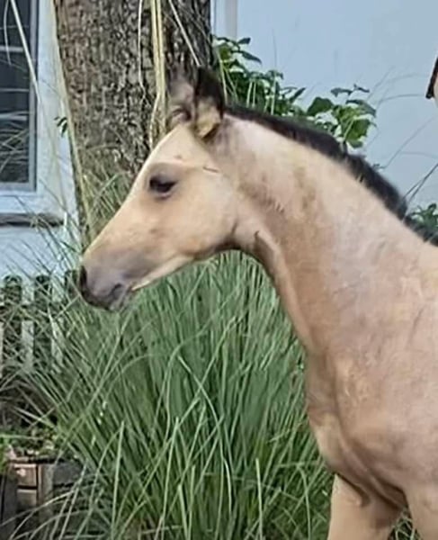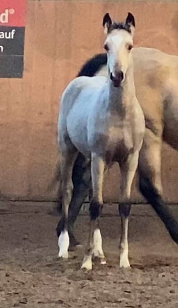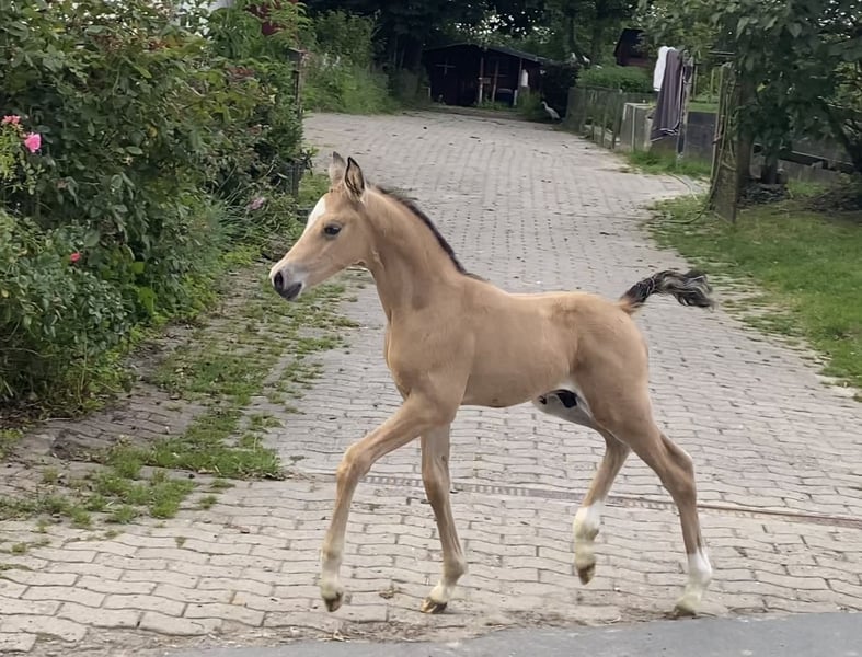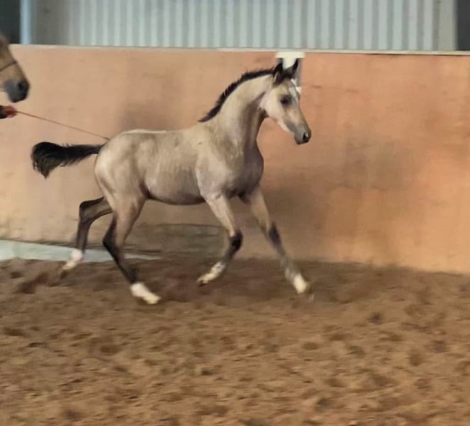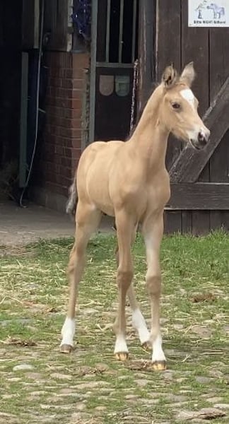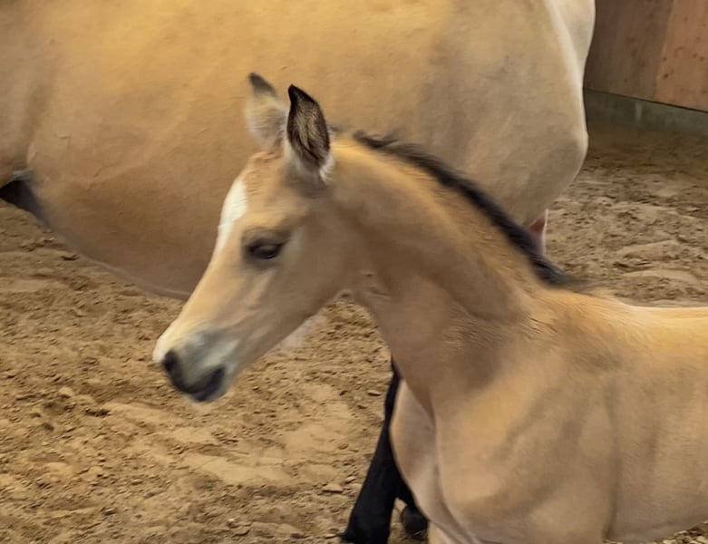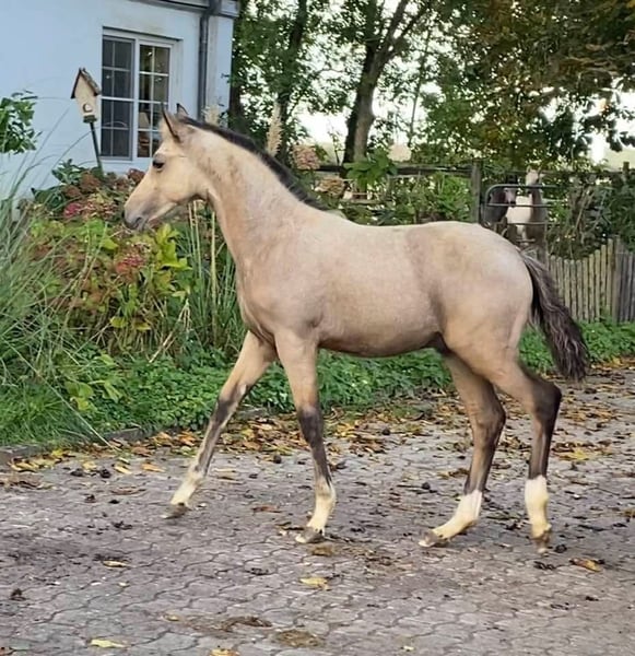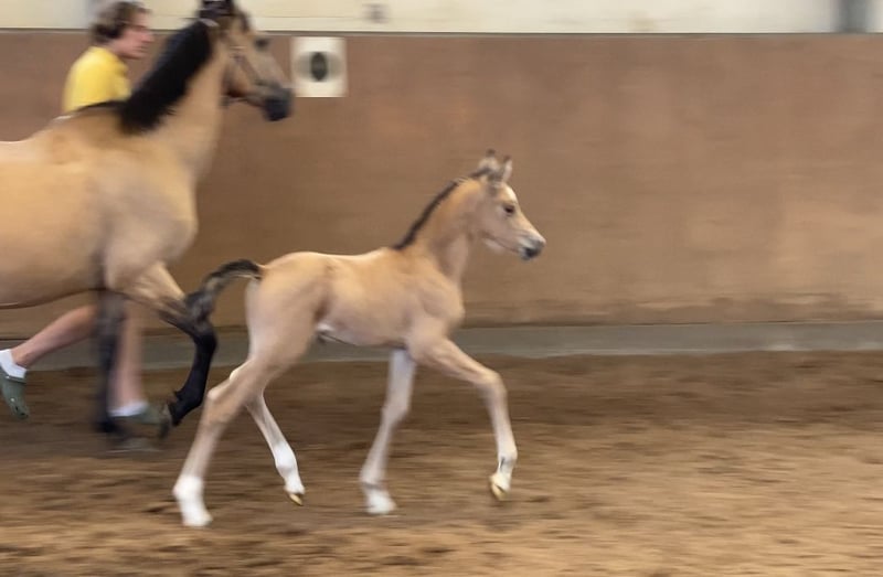 For sale: German Riding Pony colt – Buckskin, born 2024 We are offering a stunning colt with great potential. His movements are lively and expressive. With his wonderful temperament, he immediately captures everyone's heart. A fantastic sport pony is developing here. His dam is already a broodmare, and his sire, Neverland, is highly successful internationally and a top sire!