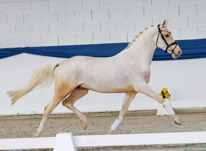 In unserer Kollektion stehen streng selektierte Youngster f�r alle Anspr�che: Ausbildungs-, Zucht- und Kinderponys Hier gelangen Sie zur Gesamtkollektion: https://ponyforum.auction Lernt man diesen Palominohengst kennen, kann man ihn sich direkt als top Reitpony vorstellen! Divertimento bringt alles mit, was ein modernes Reitpony braucht. Ablauf, Charakter, Einstellung – hat er alles. Durch seine Körung in Münster-Handorf im vergangenen Winter kennt der Hengst bereits Freispringen und Longenarbeit, hier zeigt er besonders eindrucksvoll, wie gut er sich in der Arbeit anbietet und mitmacht. Sein Vater Doppelklang ist aktuell hocherfolgreich in Dressurprüfungen der Klasse M, er hat mit den Hengsten Dreiklang und Danny Gold wahre Rittigkeitsvererber im Pedigree. Beim Namen der Mutter unseres Junghengstes werden Ponyfans direkt aufhorchen, hier steht die Staatsprämienstute Deep Red von Dimension AT zu Papier. Diese bedeutende Stute konnte sowohl die Westfälische Elitestutenschau in Münster sowie das Deutsche Stutenchampionat in Lienen gewinnen! Bevor sie dann in die Zucht wechselte, war sie nicht minder im Sport erfolgreich, hier nahm sie am Bundeschampionat teil und war bis zur Klasse L platziert.