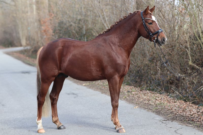 Zum Verkauf steht der sehr brave gekörte vierjährige Reitpony Hengst Springs Never Hide. Er stammt ab von Neverland WE aus einer Casino Royale K Mutter. Er wurde aktuell mit 1.41m eingemessen und somit ein Reitpony in kleinerem Maß. Er deckt allerdings sehr gut ab und kann auch von kleineren Erwachsenen gut geritten werden. Der kleine Muck zeigt sich vielseitig veranlagt. Er ist mit drei sehr guten Grundgangarten ausgestattet und zeigt sich beim Springen mit viel Übersicht und einer guten Technik. Im Februar 2025 erhielt er das Prädikat gekört. Er läuft bei uns derzeit Barhuf und ist sowohl Schmiede- als auch Verladefromm. Er wurde regelmäßig geimpft und entwurmt und war bei uns bisher nie krank. Der kleine Muck wurde letztes Jahr kurz angeritten und hat dann noch einmal den Sommer auf der Weide genossen. Seit Anfang diesen Jahres ist er jetzt wieder in Arbeit und lässt sich bereits sehr brav in der Halle und auf dem Platz auch mit anderen Pferden zusammen (auch Stuten) reiten. Dabei ist er zu jeder Zeit außergewöhnlich brav und möchte alles richtig machen. Er macht auch bereits kleine Sprünge in Folge unter dem Sattel und war auch schon kleine Stücke ausreiten. Ihn zeichnen hohe Rittigkeitswerte und seine unglaubliche Unerschrockenheit aus. In der Arbeit zeigt er sich stets motiviert, brav und sehr lernwillig. Hier wächst ein vielversprechendes Nachwuchskinderpony mit Potential in allen Sparten heran. Das Pony befindet sich auf dem richtigen Weg, muss aber noch weiter korrekt ausgebildet werden und ist deshalb nichts für reine Anfänger. Er wird allerdings bereits jetzt von einem 10jährigen Mädchen mitgeritten und macht das super brav mit. Somit kann ich ihn mir auch sehr gut für ein Mutter-Kind Gespann vorstellen. Ein gut reitendes Kind mit Unterstützung eines Trainers und regelmäßigem Beritt ist ebenfalls denkbar. Im Umgang ist er brav und sehr verschmust und genießt jede Aufmerksamkeit, die er bekommen kann. Er zeigt keinerlei Hengstunarten und lässt sich zu jederzeit gut Händeln. Er geht auch aktuell noch täglich mit einem Kumpel gemeinsam aufs Paddock und zeigt sich dabei sehr verträglich. Mit ein wenig Zeit, Geduld und Ausbildung wächst hier ein richtiges Traumkinderpony heran. Er wird im Auftrag der Züchterin verkauft und kann gerne jederzeit Probegeritten werden. Videos existieren und können bei Bedarf gerne versendet werden. Bei Fragen bitte per Nachricht oder unter 017630317998 melden.