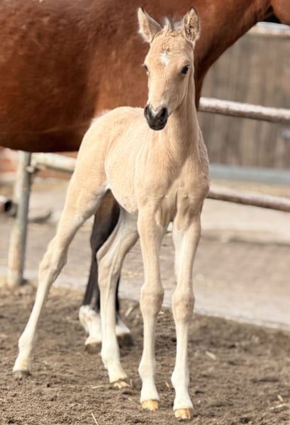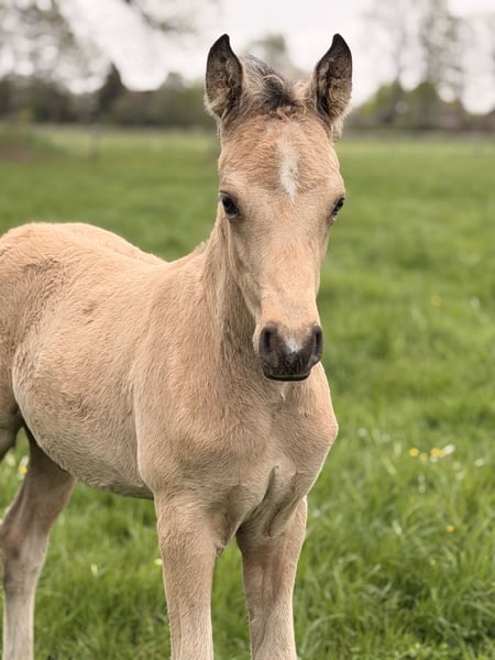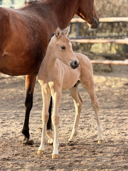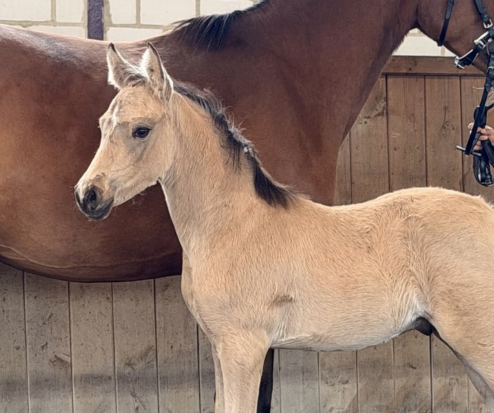 Zum Verkauf steht dieser typstarke schön aufgemachte Reitponyhengst in der Farbe Buckskin mit viel Schwung und gutem Antritt. Er ist Ende Februar geboren und dürfte im Herbst in sein neues Zuhause ziehen. Vater ist der Prämienhengst Bailador GM PP, der auf den Ponyforum Hengsttagen glänzen konnte und auf dem Wege ist, ein international erfolgreiches Sportpony zu werden. Bailador GM PP besticht neben seinen 3 sehr guten GGA durch seine enorme Kopfklarheit und Rittigkeit. Die Mutter ist die Vb.Pr. LS Donnamia von D-Gold AT NRW x Black Eyed Peas x TBMM. Aus ihrem Stamm gehen einige erfolgreiche Sportponys hervor. (Stamm der Daisys Dolly). Donnamia selbst konnte unter anderem mit guten Noten für Trab (8,0), Galopp (8,5) und Rittigkeit (8,5) bei ihrer SLP punkten. Hier wächst ein Reitponyhengst heran, dem alle Türen offen stehen. Er wird im Endmaß stehen. Er wächst artgerecht im Herdenverband mit anderen Fohlen auf. Fohlen-ABC sitzt. Privatverkauf. Video vorhanden. Bitte nur ernst gemeinte Anfragen.