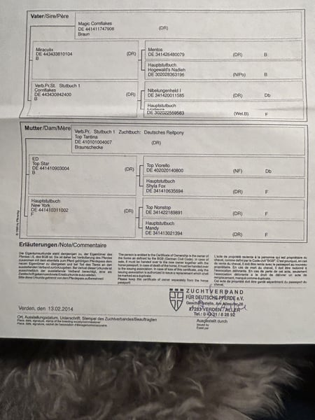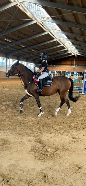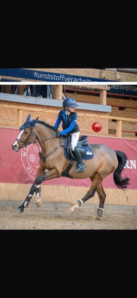 Zum Verkauf steht eine elegante und bildschöne deutsche Reitpony-Stute, geboren im Jahr 2013. Wegen eines Sehnenschadens läuft sie aktuell nicht im Sport und ist tragend von Mylord Manolito. My Hetty überzeugt ihrerseits durch ein hervorragendes Papier, Vater Magic Cornflakes und MV Top Star. Sie besticht durch ihre Springfähigkeit und ihre angenehme Art im Umgang. Sie hat immer einen sehr guten Job mit Kindern, v.a. mit jüngeren Kindern gemacht. Parallel zur Trächtigkeit heilt der Sehnenschaden natürlich ab. Wenn sie zurück in den Sport geht, dann sehen wir sie eher im WBO- Bereich, um ihre Beine nicht zu überlasten. Es ist Hettys 1. Fohlen. Bei Interesse und für weitere Informationen stehe ich gerne zur Verfügung.