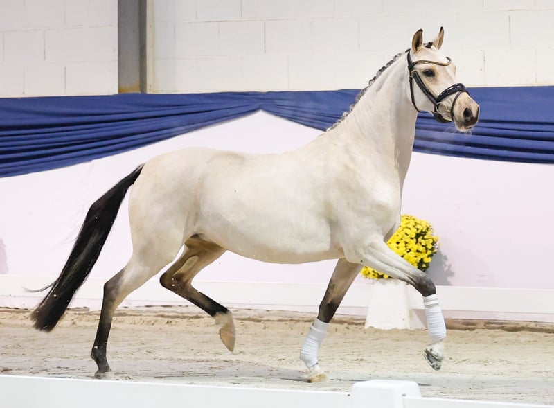 In unserer Kollektion stehen streng selektierte Youngster f�r alle Anspr�che: Ausbildungs-, Zucht- und Kinderponys Hier gelangen Sie zur Gesamtkollektion: https://ponyforum.auction Mit dieser eleganten Buckskin-Stute steht ein weiterer unser sogenannten „Luxus-Youngster“ in der Kollektion! Luxus deshalb, weil die Stute schon gut angeritten ist und direkt in die weiterführende Ausbildung genommen werden kann. Pandora wurde bei uns eingeritten und wir können daher mit absoluter Sicherheit sagen, dass dieses Pony tatsächlich noch keinen falschen Schritt getan hat! Sie ist super gefällig im Umgang, ein ausgesprochen liebes und freundliches Pony. Und auch unter dem Sattel bestätigt Pandora diesen Eindruck! Sie steht sicher an den reiterlichen Hilfen, ist von Beginn an auffallend ausbalanciert und trägt sich schön. Eine Stute, die ein top Reitgefühl vermittelt und absolut unbeirrbar und unerschrocken mitarbeitet, immer mit einer super Hinterhandaktivität. Eine absolute Empfehlung für Dressurreiter, aber sicherlich auch schon bald für die Arbeit mit Kindern.