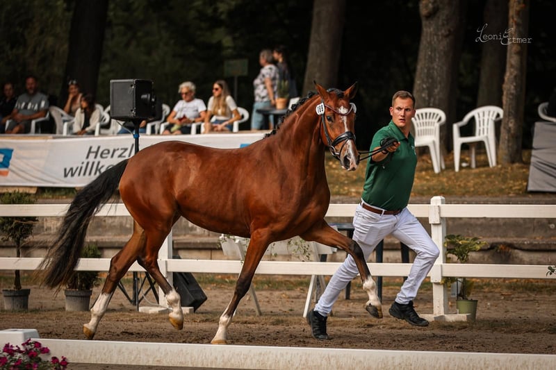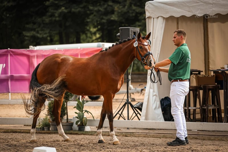 Zum Verkauf steht eine wunderschöne deutsche Reitpony-Stute mit Staatsprämie, geboren im Jahr 2021. „Heidi“ ist ideal für den gehobenen Dressursport geeignet und begeistert nicht nur mit einer angenehmen Rittigkeit sondern auch mit ihrem absolut liebenswürdigen und ehrlichen Charakter. Sie wurde 3 jährig schonend angeritten und hat danach noch mal auf der Wiese eine Pause zum reifen bekommen. Jetzt ist sie seit 3 Wochen zurück im Stall und weiß stets zu begeistern. Auf dem gezeigten Video hat sie grade erst um 6. Mal wieder einen Sattel drauf gehabt. Ganz egal ob Kinder, Traktoren, Hunde oder ausreiten - dieses Pony ist stets kopfklar und ausgeglichen. Hier wächst ein echter Nachwuchsstar heran! Ein guter Röntgentüv inkl Hals u. Rücken liegt vor! Auch für Züchter stets interessant, aus ihrem Mutterstamm gehen bereits einige gekörte Hengste als auch Staatsprämienstuten hervor, unter anderem kein geringerer als Assenmachers Gentleman! Noch fehlt es ihr ein wenig an Kraft, jedoch entwickelt sie sich von Tag zu Tag weiter und wird bei weiterer Ausbildung im Preis steigen. Bei ernsten Interesse stehe ich gerne für Rückfragen zur Verfügung.