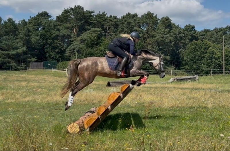 Barbie Spring Talent with Charm – 6-year-old Chestnut Mare (14.3 hh) This beautiful pony mare is not only a real eye-catcher with her sweet expression, but also has all the sporting qualities: 6 years old, approximately 14.3 hands high, with top lineage (Blitz and Donner × Quaterbacks Junior). Last year, she already competed confidently at two small dressage competitions – including with children – and this year, she was introduced to jumping up to A-level show jumping. She demonstrates a lot of ambition over fences and a clear “will to go to the other side.” She has already been ridden comfortably by children and is equally at ease going alone or in a group in the field. Small cross-country jumps have also been successfully completed. She goes alone into the terrain, whether with or without a saddle – Barbie is up for any adventure. A fantastic young pony for versatile sport disciplines, with excellent potential for ambitious riders! Contact via WhatsApp at 01798401555
