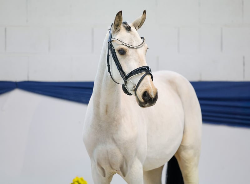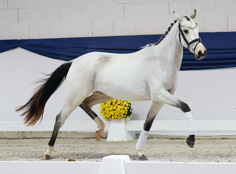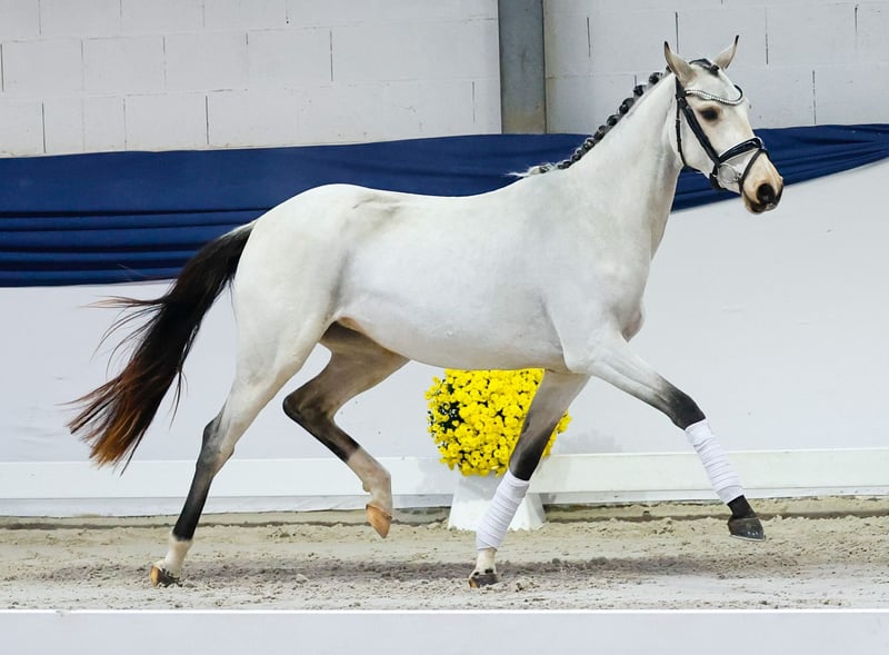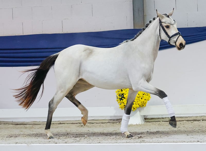 Our collection features carefully selected young horses suitable for all disciplines: training, breeding, and children's ponies. You can view the entire collection here: https://ponyforum.auction This sporty two-year-old Buckskin mare is still in the midst of her physical development. Pollyanna has come directly from group upbringing and often stands there, wonderingly, about where life has taken her! She learns something new every day and bravely faces all challenges. In the arena, during free movement, she already demonstrates a large, flowing gait with plenty of impulsion and beautiful elasticity. Her sire, Diamantino Gold, was Reserve Champion at the Hanoverian main licensing and has already won dressage tests at class L level as a six-year-old this season. Her dam, Polly Peachum, is full sister to the champion stallion and Bundeschampion Playback. From this dam line, countless top sport horses have emerged, achieving success up to the European Championships, DJM, PdB, and more. Directly from the breeder.