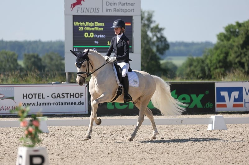 Glitzerflitzer es un pony confiable y tranquilo que brinda seguridad a su jinete en todo momento. Especialmente en paso y trote, destaca por su gran calidad, ritmo y una postura cómoda. Ha participado en varias pruebas de Pony FEI, logrando buenos resultados, con hasta un 69,* %, demostrando siempre claridad, fortaleza nerviosa y motivación. En la categoría nacional, Glitzi ha ganado varias pruebas de doma en nivel L, incluso con notas de hasta 8,5. Además, ha competido varias veces en los Campeonatos de Pony del sur de Alemania y en el Campeonato de Hesse. Es muy dócil en el trato, tiene la mente clara y, por ello, se mantiene tranquilo en nuevas situaciones, ya sea en concursos, entrenamientos o en el día a día. Glitzi quiere agradar siempre a su jinete y trabaja con motivación. Brinda mucha seguridad a su jinete y es ideal para un jinete en crecimiento con aspiraciones de seguir compitiendo en el deporte de competición.