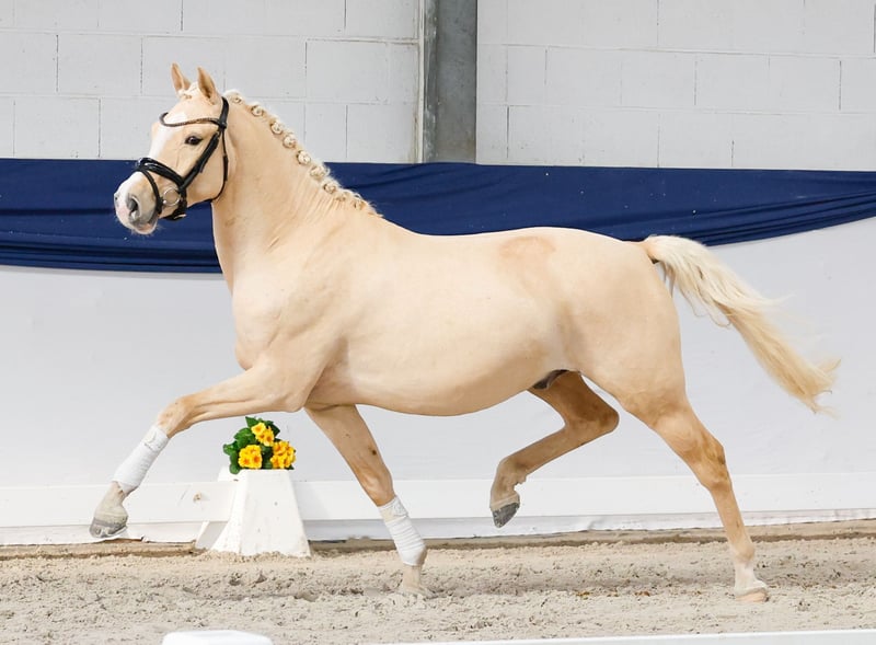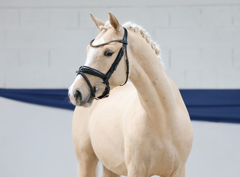 In unserer Kollektion stehen streng selektierte Youngster f�r alle Anspr�che: Ausbildungs-, Zucht- und Kinderponys Hier gelangen Sie zur Gesamtkollektion: https://ponyforum.auction Der dreijährige Galaxy ist ein weit entwickelter und sehr maskulin aufgemachter Wallach, schon im Standbild fällt er direkt auf! Galaxys beeindruckendes Bewegungspotential lässt den Betrachter schwärmen. Der dynamische und kraftvolle Ablauf des Palominos wird von seiner aktiven Hinterhand getragen, immer unter den Körper fußend. Der Youngster trägt sich bereits jetzt schon auffällig schön und imponiert mit seiner Selbsthaltung. Galaxy stammt aus derselben Mutter wie der Bundeschampion Golden State, dessen Gene in der Ponyzucht über seinen Sohn Golden Grey und Enkelsohn Gold Garant weit verbreitet sind. Sein Vater Gold Edition D war Bundeschampionatsfinalist und ist siegreich in Aufbauprüfungen. Galaxy kommt direkt aus der Aufzuchtgruppe und ist noch roh, kann aber mit seiner top Konstitution direkt in die Ausbildung starten.
