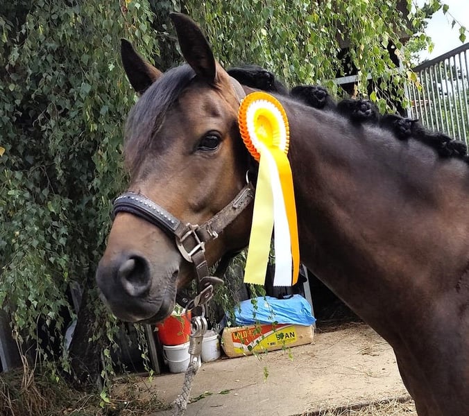 For those who appreciate the extraordinary, Casanova is a must-see. His name already reveals what makes this pony special: a true charmer with a unique personality that immediately wins hearts. Thanks to his particularly friendly, fearless character and positive work attitude, he is a reliable partner whether in handling, hacking out, daily training, or at competitions. With his three very good basic gaits, especially his outstanding canter, he always provides a pleasant riding experience and is an ideal pony for both young riders and ambitious adults. Despite his young age, Casanova already possesses the potential of a genuine sport pony, while also having the heart of a child's pony. He is a true heart pony that impresses not only with his quality but also with his wonderful temperament. He has already demonstrated this quality impressively in competitions: he has placed successfully multiple times in dressage tests for young horses, even winning against larger horses with a top score of 8.2. This not only showcases his talent and rideability but also his impressive nerves and calmness. With further development, he is destined to become an outstanding partner for pony sport, leaving no wishes unfulfilled. A video can be sent upon request.