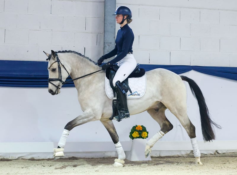 In unserer Kollektion stehen streng selektierte Reitponys f�r alle Anspr�che: Ausbildungs-, Zucht- und Kinderponys Hier gelangen Sie zur Gesamtkollektion: https://ponyforum.auction Mit diesem typstarken Falbwallach steht ein interessantes Nachwuchspony in unserer Kollektion. Mr. Grey ist ein fünfjähriger Wallach mit abgeschlossener Grundausbildung. Unsere Bereiter geben ihm für seinen Charakter, seine Nervenstärke und seine Arbeitsbereitschaft beste Noten! Grey macht im Training tolle Fortschritte, er wird immer geschmeidiger im Ablauf und er lernt gut. Er ist so ein bisschen Minimalist und gibt im Training das, was man von ihm fordert – aber immer bereitwillig und kooperativ. Lässt man ihn bummeln, dann bummelt er halt. Möchte man eine Schippe drauflegen und ernsthaft ans Training gehen, ist er aber genauso beim Reiter und macht mit! Er ist total relaxed mit anderen Ponys in der Bahn, Umwelteinflüssen von außen usw. Hier wird sich die weitere Ausbildung lohnen, wir können uns Grey auch hervorragend unter dem Sattel einer Kombi von ausbildender Mutter und jüngerem Kind vorstellen, er ist ein ganz ehrliches und reelles Pony.