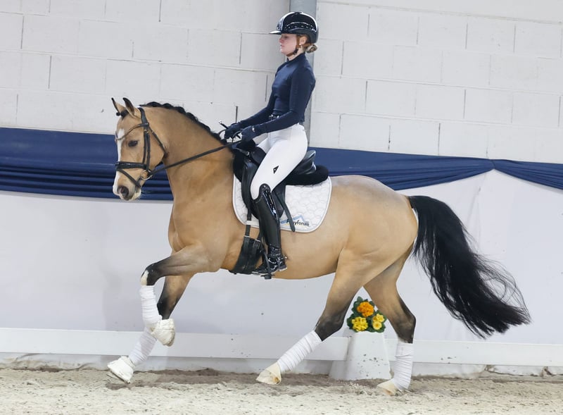 In unserer Kollektion stehen streng selektierte Reitponys f�r alle Anspr�che: Ausbildungs-, Zucht- und Kinderponys Hier gelangen Sie zur Gesamtkollektion: https://ponyforum.auction 1. Reservesiegerhengst Körung Münster Platziert in Dressurpferdeprüfungen Klasse A Die Karriere dieses bildschönen Falben startete bereits im Alter von zwei Jahren bei der Westfälischen Reitponykörung in Münster, hier wurde Mr. Malfoy gekört, prämiert und sogar zum 1. Reservesieger gekürt! Er trat damit das große Erbe seines berühmten Vollbruders an, dem Siegerhengst und Bundschampion Movie Star. Malfoy wurde sorgfältig in Ruhe ausgebildet und in der vergangenen Saison erstmalig fünfjährig im Turniersport eingesetzt. Drei von vier Starts konnte er direkt in vordere Platzierungen in Dressurpferdeprüfungen der Klasse A umwandeln. Besonders die Galopp- und Schritttour des Wallachs setzen aktuell Highlights, Malfoy ist ein sehr rittiges und arbeitswilliges Pony und eine absolute Offerte für die weitere Ausbildung zum FEI-Pony.
