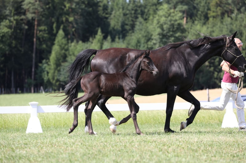 Here we offer a black colt by FLORICELLO OLD out of the Hanoverian state premium and elite mare SAPHIRA by SANDRO HIT x DONNERHALL x PIK BUBE x FUTURO. The foal is in perfect health, has a refined physical appearance, is jet black, and moves with ease. Born on May 29, 2025. The mother of the foal is a direct sister to the mare HEIDEBLUME, who is also the mother of the current Aachensieger ZONIK PLUS. The mother of the foal has been awarded elite mare status and DSP premium mare status due to her own sport-successful offspring. Her most successful offspring include SCHWARZE PRINZESSIN by NEGRO, who has been successful at S* level, and JOHN F. KENNEDY by JOHNSON, who has won at M** level. The grandmother of the foal, StPrSt. DOREEN by Donnerhall, is registered in Hanover with a score of 10 for her walk. This expansive walk is consistently found in her descendants. The colt can remain with us for upbringing if needed. For serious inquiries, please call directly: 0172 - 839 66 50 - Rainer Lechl.