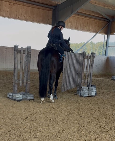 Beautiful 10-year-old Diacontinus daughter! 16.0 hh Daphne is well-behaved and well-mannered both on the ground and under saddle. She is currently ridden regularly in the arena and in the field. She is familiar with lunging on double longe, dressage work, working equitation, and jumps small courses. However, she is not suitable for complete beginners or nervous riders. She does not buck or rear! Daphne is very light in the mouth and masters all kinds of lateral movements. Flying changes have been introduced. Due to health findings that do not affect her performance, she is being offered at a significantly reduced price. Video available. Please contact via WhatsApp directly at 017651788446.
