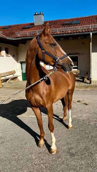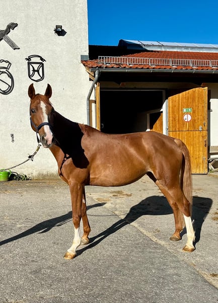 **Sales Advertisement: German Sport Horse** For sale is a talented and affectionate mare, born in 2015. She is a beautiful chestnut with a height of 165 cm and impresses with her athletic abilities in show jumping. This mare is distinguished not only by her excellent performance in the arena but also by her balanced temperament and high willingness to learn. She is suitable for both experienced riders and ambitious young riders who wish to further develop their skills. She is placed in A-level show jumping and A-level dressage. The mare has already had 2 foals. If you are interested or need further information, please feel free to contact me. Visit us and see for yourself this wonderful mare!