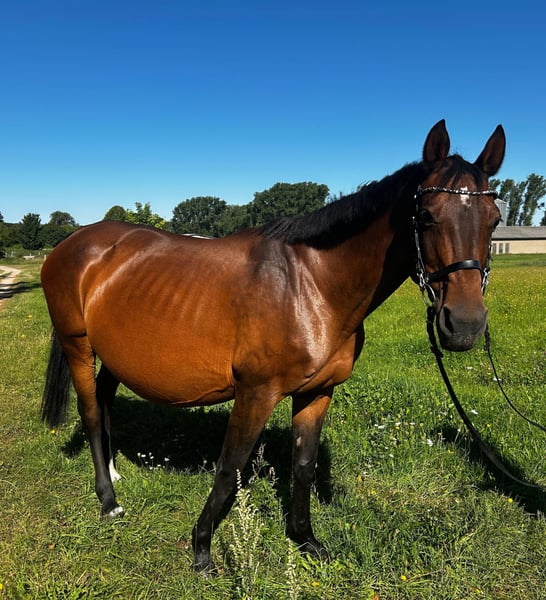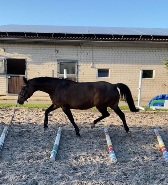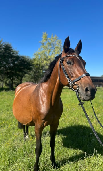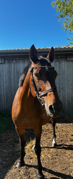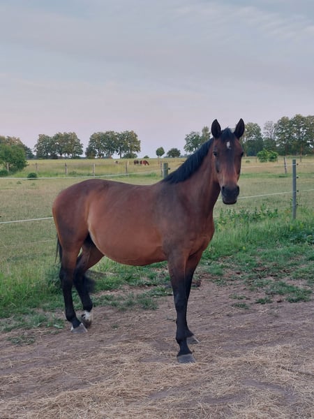Chira Bella is a 2006-born German sport horse mare by Cancoon out of a Wandervogel II dam. She is an absolutely lovable and uncomplicated horse that consistently shows no problems in daily management. Whether in box housing or in a robust environment – she is familiar with both and, due to her low rank, is very easy to integrate into any herd. With us, Chira Bella has been used exclusively for breeding. She has easily conceived and given birth to her foals without complications and independently. Last year, she gave us a beautiful filly, and currently, she is raising a wonderful colt at her side. Due to the foal, she can only move to her new home from mid-October. Bella was also successfully used for breeding by her previous owners, here are some successes of her offspring: Aye Aye Captain (2018) is already M**-placed, just like her older brother Gilbert F (2012) - already as a young horse placed in show jumping M** with a score of 8.2, as well as Lucky Luke (2010) who was sold to the USA and is successfully placed at 1.35m there. With a height of about 1.60 m, she is not only a compact large horse but also certainly interesting for pony breeding. Bella is regularly vaccinated, dewormed, and her teeth have been recently done. Additionally, she has been regularly lunged for her health and cared for by children, during which she has always shown to be absolutely well-behaved. Due to her friendly nature and calm demeanor, she is also excellently suited for breeding purposes or as a loving companion. We are reluctantly parting with her due to a reduction in our stock and wish for her a home where she will continue to be appreciated and cared for.