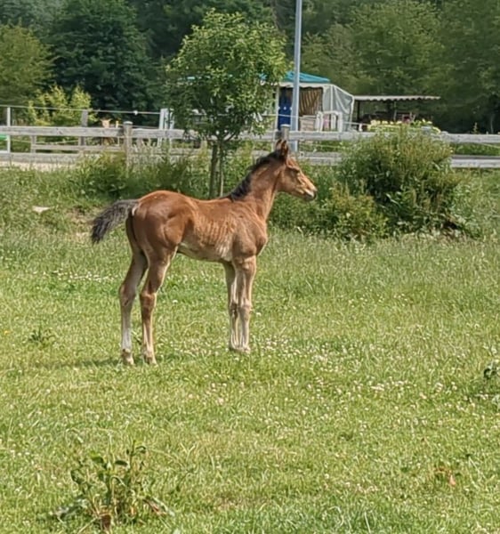 Aus eigener Zucht bieten wir dieses typvolle, schicke und sportliche Stutfohlen mit korrektem Fundament an. Vater Chaloubino PS war erfolgreich in internationalen Youngstertouren vertreten und im Finale der Springpferde-WM in Lanaken/BELbelegte er den siebten Platz. Außerdem hat er mit Cento und Baloubet du Rouet hochkärtige Springgenetik in seinem Pedigree vorzuweisen. Die Mutter wurde bis 105 cm vorgestellt. Ihr Vater Jama van de Heffinck war bis S** erfolgreich. Nähere Infos und Videos gerne per WhatsApp!!!