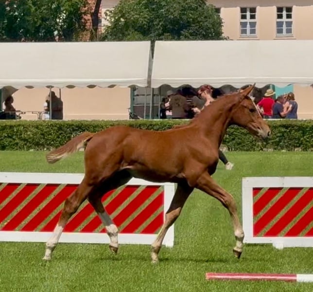 Elli is a very typestong charming foal with top-class basic gaits and an absolutely sporty temperament! Her mother herself was successful up to 1.35m and has already produced offspring up to the heavy class, as well as a variety of premium and championship foals, just like Elli, who was able to perform excellently at the foal championship in Neustadt Dosse. Her father, Erich van de Kietzhöwel, is 6 years old and already stands at 1.35m, having been a finalist at the World Championships in Zangersheide last year. She is farrier-friendly and loading-friendly, as well as halter-trained.
