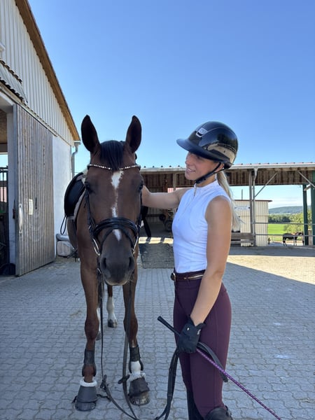 Verkaufe deutsches Sportpferd – elegante Dunkelfuchsstute Zum Verkauf steht eine wunderschöne deutsche Sportpferdestute, geboren im Jahr 2020. Mit ihrem beeindruckenden Stockmaß von 170 cm vereint sie Kraft, Eleganz und Ausdruck. Unsere selbstgezogene Stute Tonia BL zum Verkauf – eine außergewöhnlich talentierte und bildschöne Nachwuchsdame mit Perspektive für den gehobenen Dressursport. Abstammend von Fürst Nymphenburg x Topas (Sohn des legendären Totilas) vereint sie beste Rittigkeit, ein ausgeglichenes Temperament und drei überdurchschnittliche Grundgangarten in einem modernen, sportlichen Typ. Die elegante Fuchsstute überzeugt durch Leichtrittigkeit, Lernfreude und Ausdruck. Tonia wurde mehrfach erfolgreich in Dressurpferdeprüfungen der Klasse A vorgestellt und konnte in ihrer ersten Dressurpferde L – ohne viel spezifische Vorbereitung – direkt mit der Wertnote 7,22 glänzen. Sie zeigt sich im Training stets motiviert und konzentriert. Außengalopp, Schulterherein und Kurzkehrtwendung beherrscht sie bereits sicher, und auch Trab- und Galopptraversalen gelingen ihr mit großer Leichtigkeit. Doch Tonia ist nicht nur im Dressurviereck zu Hause: Sie zeigt Vermögen und Übersicht am Sprung, gepaart mit einem schnellen, wachen Vorderbein und viel Spaß an der Arbeit. In einer Gewöhnungsspringprüfung präsentierte sie sich souverän und mit viel Übersicht – ganz die vielseitige Reiterin’s Partnerin. Im täglichen Umgang ist Tonia unkompliziert, brav und absolut menschenbezogen. Sie ist fein zu reiten, ehrlich im Charakter und damit auch für ambitionierte Amateurreiter bestens geeignet. Ein weiteres Highlight: Tonia hat bereits ein gesundes, typvolles Fohlen zur Welt gebracht – ein weiterer Beweis ihrer Qualität, auch als zukünftige Zuchtstute. Eine Stute, die in jeder Hinsicht überzeugt – für Reiter, die Leichttrittigkeit, Perspektive und Charme in einem Pferd vereint suchen. 📍 Standort: Ausbildungsstall Berner-Leis, Aurach (Mittelfranken) 📞 Videos & weitere Informationen: 0155 6014 9005