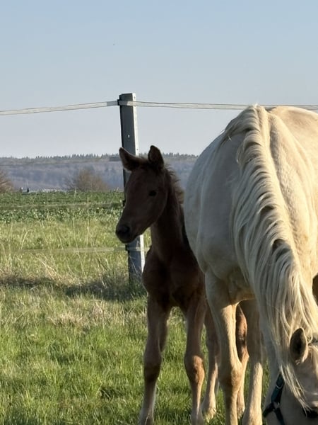 Stijlvolle merrieveuling in een speciale kleur (non-seasonal Palomino) Geboren uit Vald'Aran, een Verband-prijskampioen uit de merrie Sommertraum Op de foto (actueel) is het veulen 14 dagen oud