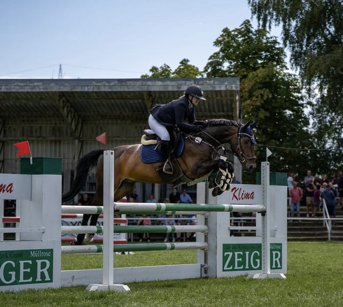 Zum Verkauf steht ein 10 Jähriger Stakkato Gold Wallach, liebevoll „Goldi“ genannt. Er ist 1,64m groß und seit seinem 5. Lebensjahr in meinem Besitz. Er schenkte mir meine ersten L und M Platzierungen und ist somit ideal geeignet für ein junges Mädchen, welches er durch seine Sicherheit am Sprung in den Turniersport und den Sprung in Klasse L weiterbringen wird. Goldi macht sehr sehr selten Fehler und nahezu jede Distanz möglich. Er hat über 20 Siege sowohl im Stil- als auch im Fehler/Zeitspringen der Klasse A und L außerdem ist er bereits M platziert. Goldi ist aktuell Vizekreismeister in meiner ersten Damentour und hat mit mir 2 mal die Kreismeisterschaft der Junioren und Jungen Reiter gewonnen sowie dazu auch das Hallenchampionat der L Tour. Natürlich ist er Verlade- und Schmiedefromm. Ich war mit ihm auch alleine auf dem Turnier unterwegs. Generell ist er ein sehr ruhiges Pferd, das sowohl vom Boden aus als auch beim reiten immer händelbar ist. Bei mir war er die 5 Jahre immer gesund und unverletzt. Goldi steht in 12623 Berlin und darf gerne besucht und ausprobiert werden.