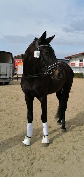 *Bellary* This impressive black gelding, born in 2022, captivates with his noble appearance and balanced temperament. Standing at a current height of 16.1 hh, he offers the ideal size for ambitious riders seeking a suitable young horse for their dressage career. This young Hanoverian has already been extensively ground-worked and demonstrates great talent and willingness to learn. Bellary is very attentive to his handler and engages well in training exercises. His elegant appearance and quality movement make him a real eye-catcher. The price will increase as his training and work under saddle progress. The gelding is healthy, regularly vaccinated, and free of any health issues. He is well-handled and easily manageable during vet, farrier, and dentist visits. If you are interested or require further information, please feel free to contact me. Available via WhatsApp at +49 155 60581906.