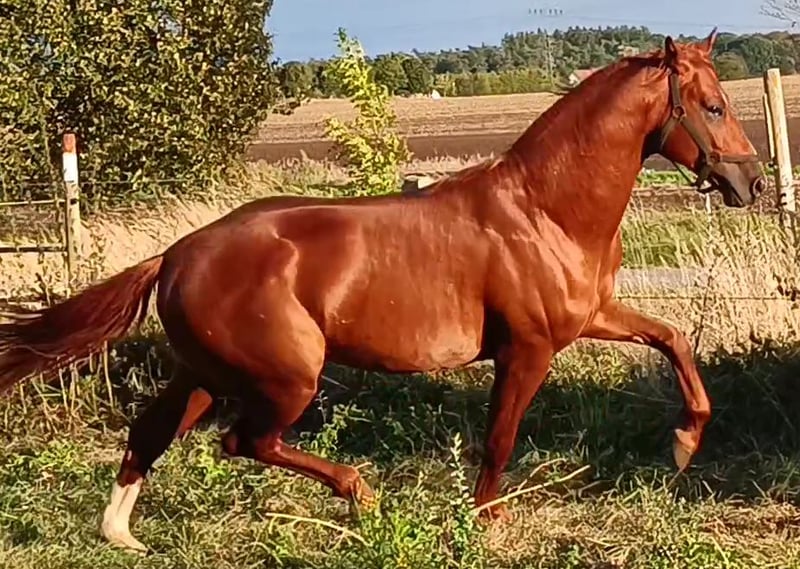 Dieser ausdrucksstarke bildschöne und brave Hengst von Escamillo x Quaterback verfügt über 3! überdurchschnittliche GGA, Nervenstärke und einem ausgeglichenen Charakter und macht auch einen guten Sprung. Er stand mit zwei weiteren Hengsten zusammen neben Stuten und war dabei sehr verträglich. Er könnte somit wohl auch mit Wallachen zusammen gehalten werden. Er war noch nie krank oder verletzt. Röntgenbilder ohne Befund. Die Halbschwester des Hengstes von Escolar war bereits sechsjährig M-erfolgreich und gehörte trotz weniger Starts sowohl 5- als auch 6-jährig zu den zehn erfolgreichen Pferden des Verbandes. Selbstverständlich kann er auf Wunsch gelegt werden. Escamillo war Prämienhengst seiner Körung 2017 in Verden, legte 2018 seinen 14-Tage-Test mit der Dressurnote 9,08 ab und absolvierte 2020 seinen Sporttest unter Helen Langehanenberg mit der Siegerbewertung von 9,36. Unter der Olympia-Teamzweiten qualifizierte er sich auch fünfjährig mit einer 9,5 für die Dressurpferde-Bundeschampionate. Züchterisch gehört Escamillo schon jetzt zu den erfolgreichsten Beschälern. Quaterback, selbst Bundeschampion (Note 10,0 auf den außergewöhnlichen Trab). Der zuletzt auf Platz vier der weltbesten Dressurvererber rangierende Elitehengst stammte aus der Neustädter P-Familie und sammelte nach seinem überragenden Sieg auf dem Bundeschampionat 2006 wiederholt Titel in Dressuren bis zur schweren Klasse. Weltweite Maßstäbe setzte Quaterback allerdings nicht im aktiven Sport, sondern in der Zucht. So lieferte der Quaterman-Sohn zahlreiche gekörte Hengste sowie im Grand Prix-Sport erfolgreiche Nachkommen.