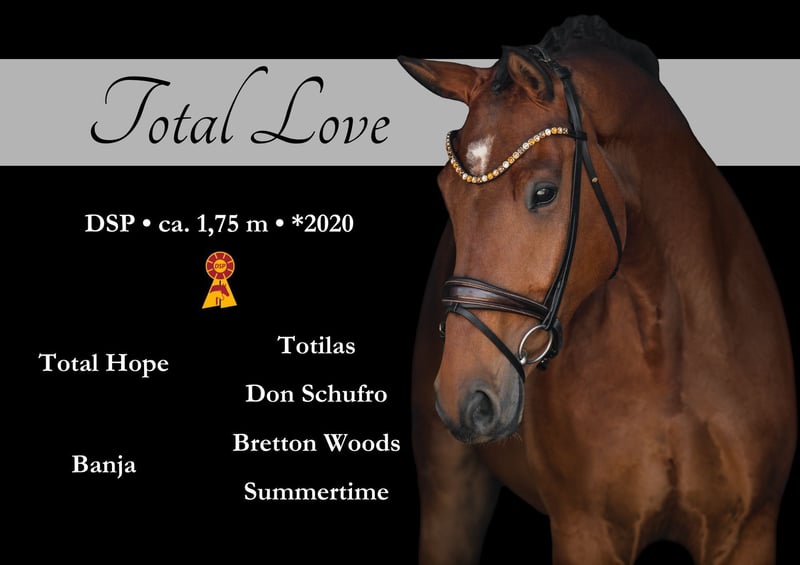 Dear interested parties, For appointment scheduling for trial rides, please send me a WhatsApp message. For further questions, I can be reached via WhatsApp during the day, and by phone best between 4 PM and 7 PM. I look forward to hearing from you. ⚜️Total Love⚜️ Age: 5 years (2020) Height: approx. 1.75 m Lineage: Total Hope x Bretton Woods Training level: Successful in Dressage Horse A, placed in L, started M X-ray: Good X-ray images available LOCATION: 84048 Mainburg For sale is a stunning 5-year-old son of Totilas with outstanding quality and an excellent success record. He impresses with an exceptional, rhythmical walk with enormous overreach, an impressive uphill canter, and an expressive trot mechanic. He has a heart of gold, is very uncomplicated and well-behaved in daily training as well as at competitions. He is very beautiful and easy to ride. He is currently on his way to class M. In riding horse and dressage horse tests of classes A and L, he has been placed multiple times with scores up to 8.5. He also goes out calmly on trails. Good X-ray images are available. An extraordinary young horse with excellent quality and top-notch character. ⚜️Tel: 0171-3438949 ⚜️a.devittorio@web.de ⚜️https://www.ehorses.de/angelinadevittorio Facebook and Instagram Angelina De Vittorio