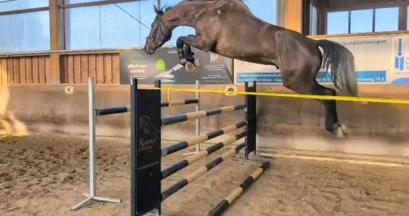 Der 6 jährige, „Mc Fly“, abstammend von Mumbai x Cardenio, 1,74 m, ist ein sehr hübscher, mit einer etwas außergewöhlichen Farbe ausgestatteter Wallach. Mc Fly bringt das richtige Maß an Go mit, bleibt dabei jederzeit händelbar und klar im Kopf, am Sprung überzeugt er mit Übersicht und Vermögen. Im täglichen Umgang ist er sehr brav, menschenbezogen, unkompliziert und will alles richtig machen. Mc Fly ist der idealen Kandidaten für jemanden der ein junges Pferd mit einer vielversprechenden Zukunft im Springsport sucht und Erfahrung in der Jungpferdeausbildung hat. Derzeit befindet sich Mc Fly in Beritt und wird vorrausichtlich in 14 Tagen seine erste Springpferdeprüfung laufen. Bei weiterer Ausbildung steigt der Preis. Direkt vom Züchter.