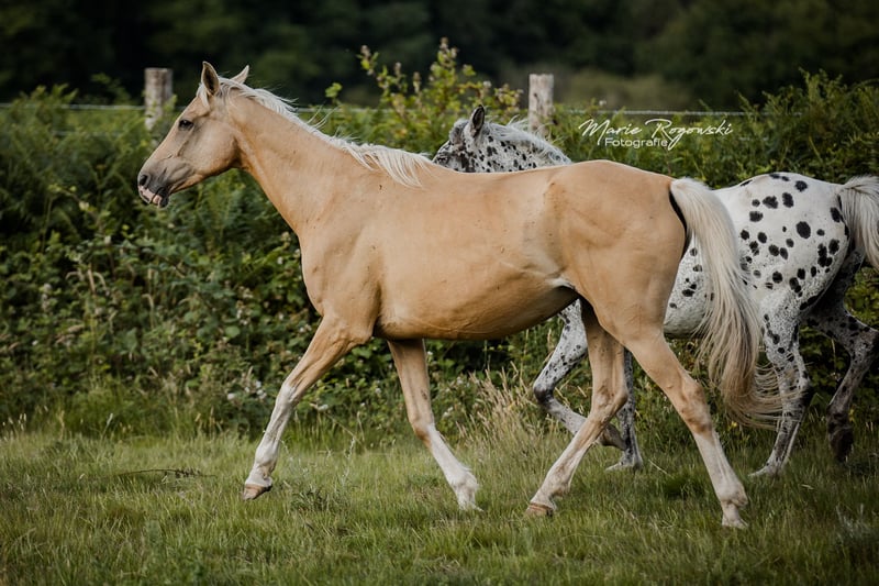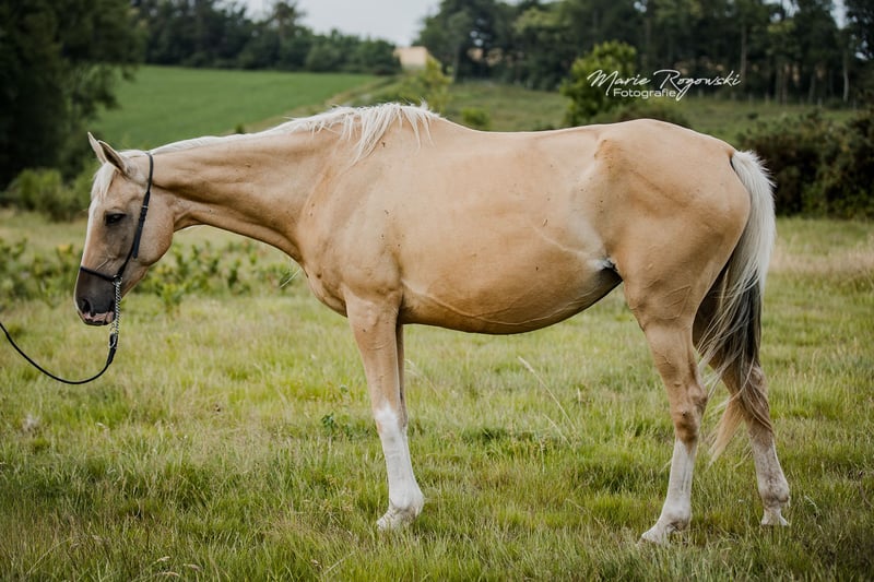 Jument pur-sang anglaise DANCE IN GOLD xx par RFF THE ALCHEMIST xx x Racey Remarque xx (USA) de notre propre élevage, éclaircie simple (palomino) avec dessin particulier (DW). Le père a été le premier pur-sang importé (doublement) éclairci avec reconnaissance Trakehner en Allemagne. Papiers allemands et français. Elle a eu quatre très bons poulains, le dernier étant une pouliche pur-sang Cremello en 2022. Vit 24/7/365 à l'extérieur de manière robuste en troupeau sur de grandes surfaces, également habituée aux transports sur de longues distances. Sabots nus, vermifugé, vacciné - renouvelé sur demande -, également traitement dentaire et ostéopathie possible. Peut être saillie au printemps sur demande, choix de 10 propres étalons pur-sang, demi-sang arabe et demi-sang arabe, place en pension très avantageuse. Vente uniquement pour cause de liquidation de stock. La jument est un excellent animal. Vente privée après avoir fait mutuellement connaissance, hébergement fourni gratuitement. Le prix indiqué ... l'euro symbolique n'est PAS le prix de vente. Le prix de vente dépend de l'acheteur et d'autres accords contractuels. Ici, l'acheteur peut marquer des points en sa faveur (ou en fin de compte en faveur du cheval) grâce à un bon mode d'élevage et / ou un lieu de vie (pas de transmission). Tous les animaux ne sont disponibles que sur présentation personnelle.