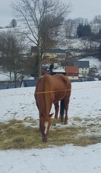 Zum Verkauf steht meine 17jährige Englische Vollblutstute. Sie ist gesund und freizeitmäßig geritten, war in jungen Jahren auf der Rennbahn. Sie hatte bisher 7 tolle Fohlen. Sie ist ein toller Freizeitpartner. Sie steht nur zum Verlauf, weil sie sich mit meiner 2. Stute nicht verträgt, die beiden passen einfach nicht zusammen. Beim Vorbesitzer stand sie in einer großen Herde und zeigte sich super sozial, stand in der Mitte der Rangordnung und kümmerte sich immer liebevoll um die Fohlen und leitete gern den dort vorhandenen Fohlenkindergarten. Bei mir steht sie im Offenstall, tagsüber auf Winterkoppel und im Sommer 24/7 auf der Weide. Sie ist frisch geimpft, letztmalig im Oktober entwurmt, tierärztlich vorgestellt und Zähne sind auch gemacht. Sie ist auch zur Zucht noch gut geeignet, das letzte Fohlen bekam sie im Juni 2024. Mit ihren 17 Jahren ist sie ruhig, aber möchte gern noch etwas arbeiten. Schreibt mich gerne an, es lässt sich über alles reden.