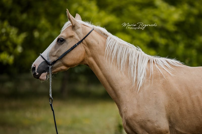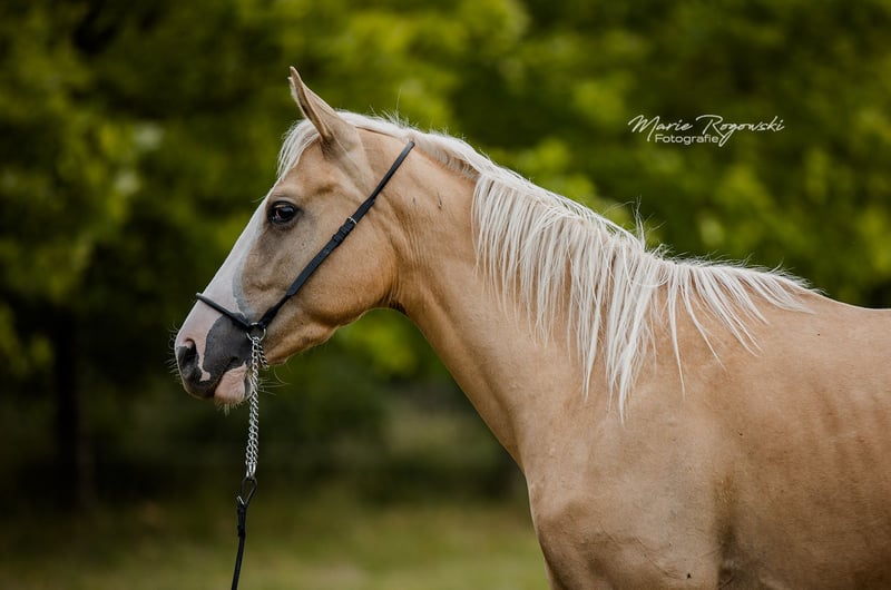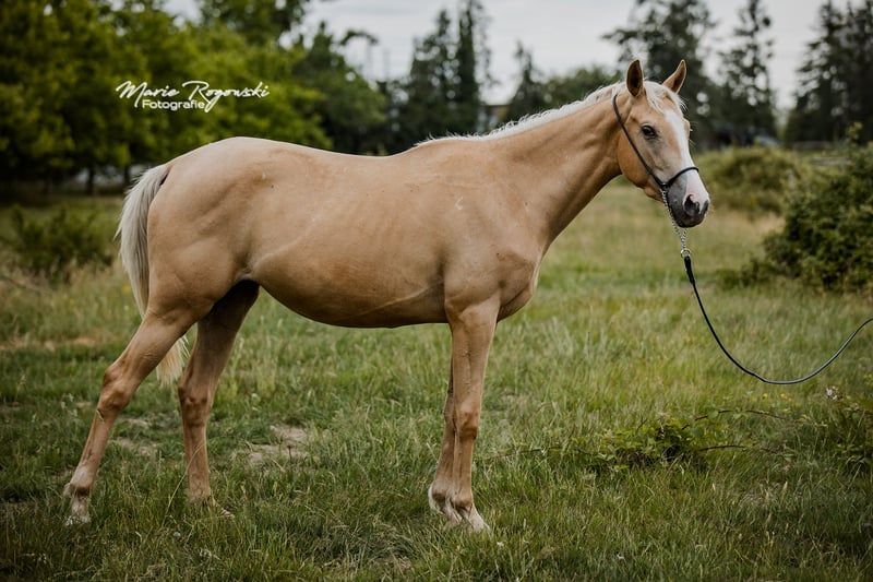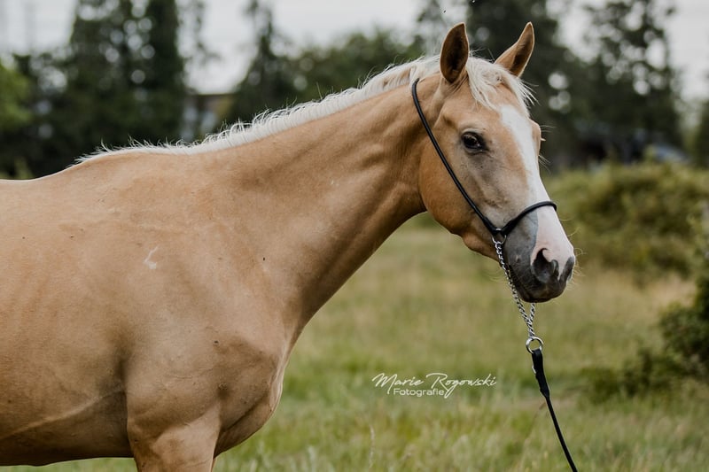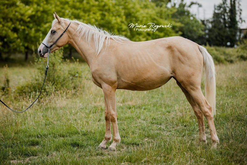 Jument | Pur-sang anglais | actuellement 156 cm | née en 2022 RICH 'N GOLD xx est une jeune jument harmonieuse et curieuse, à l'apparence claire et au physique bien proportionné. Elle se montre amicale, attentive et sociable et séduit par ses mouvements fluides et réguliers. Son père, TCF Palladium xx, est considéré comme le premier pur-sang Smoky Cream au monde et est apprécié pour ses membres corrects, son extérieur harmonieux et son caractère fiable. Sa mère, Riches xx, apporte à sa descendance une santé robuste, un tempérament calme et une expérience de l'élevage. RICH 'N GOLD xx combine ainsi des mouvements harmonieux, une ascendance remarquable par sa couleur et un caractère amical et disposé à apprendre chez un jeune cheval.