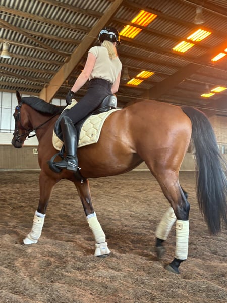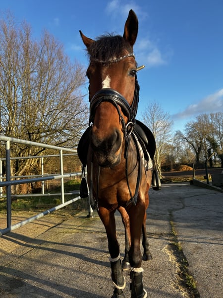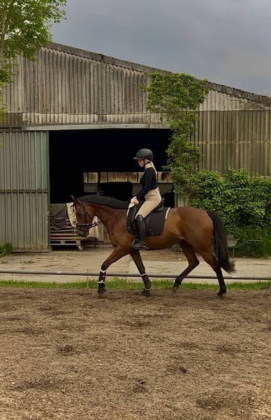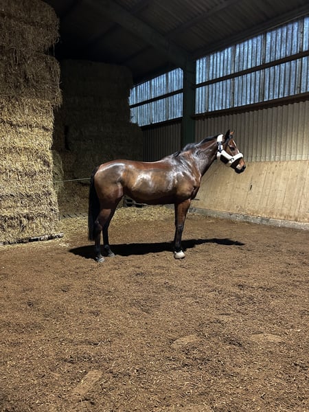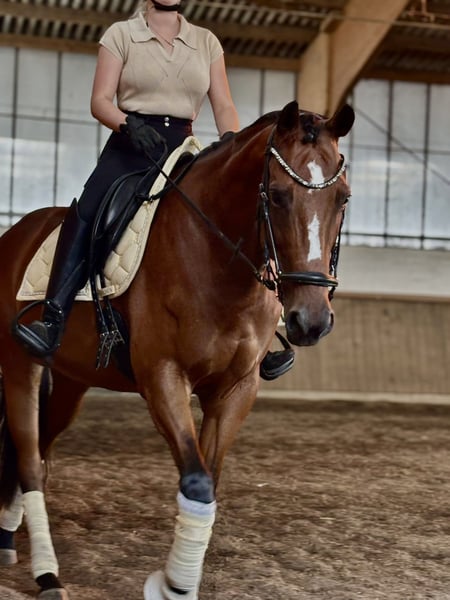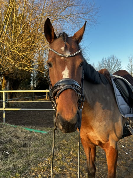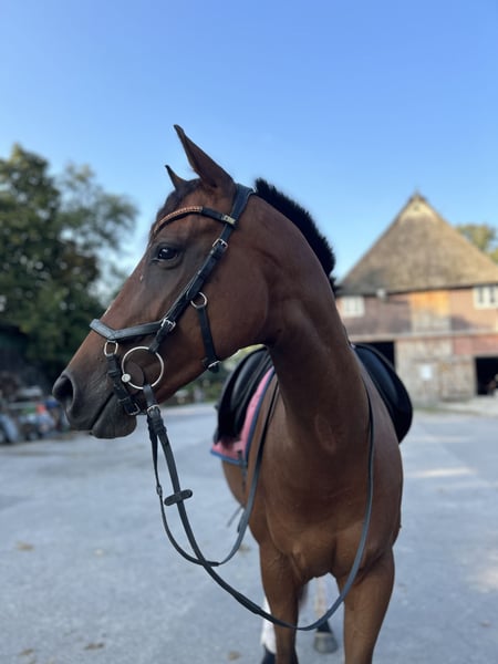 Hello dear horse friends :) Due to various reasons, I am offering my 6-year-old purebred Thoroughbred mare for sale. She stands approximately 16.1 hands high. The mare wears shoes on all four feet, with front shoes due to sensitivity and hind shoes because we have frequently dealt with hoof abscesses or other hoof injuries. Since she has been shod, we haven't encountered any further problems. At the farrier, she is now well-behaved with sedative paste, as she initially started kicking due to her recurring injuries behind. This issue is now well managed and improving daily. Her teeth were checked and floated in mid-September. She is vaccinated against tetanus and influenza; we have discontinued her herpes vaccination, as I have no ambitions for competitions. She comes with all her tack and a dressage saddle, which she is happy to be ridden in. The mare is versatile and can be used in various disciplines. She still needs further training in all directions but is always cooperative. In the field, she has been ridden both alone and in groups; however, sometimes she needs a bit of discussion about the route. Polly has been in my possession since 2023. Apart from minor issues, we have never had major problems. She has a few splints, but they do not bother her. She is very well socialized, familiar with farm machinery, bicycles, dogs, etc. I have only transported her when she was being picked up; after some reassurance, she loaded calmly, and she was quiet during the journey. Polly has brought me great happiness over the past two years. However, after a shared accident that only injured me, I no longer feel the same connection, and I want to take a break from or give up riding altogether. She is too good to just stand around, and I believe she has a lot of potential. I am looking for a nice stable where she can spend plenty of time with her herd. Naturally, I also wish for a very kind person who loves her at least as much as I do. Please note, she should not weigh more than 65 kg.