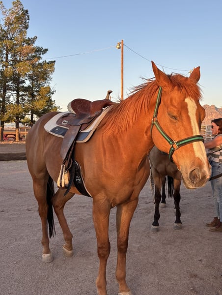 Mac è un grande cavallo con un cuore altrettanto grande. Lo possiedo da quattro anni ed è uno dei cavalli più onesti che abbia mai incontrato; cerca sempre di fare tutto ciò che gli si chiede. Ha provato un po’ di tutto, anche se non l’ho ancora specializzato in nessuna disciplina, ma ha esperienza in barrel racing, salto, trail, prove con bandiere, ha portato una corda e affrontato alcuni ostacoli come il tavolino oscillante, il fiume, i pallet, ecc. Tratta molto bene il rimorchio, si comporta bene con gli altri cavalli, è senza ferri (aveva le scarpe sulla pista) e si ferma bene dal ferratore. Non si spaventa per il traffico o i veicoli rumorosi, è molto tranquillo e rilassato di carattere. Tuttavia, essendo un purosangue, ha molta velocità e ama correre, soprattutto durante le sessioni di galoppo leggero. È rispettoso sia a terra che in sella e apprezza le coccole, specialmente dai bambini delle mie lezioni.
