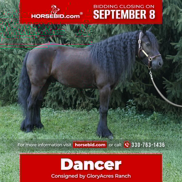 ♦️ 𝐭𝐡𝐞 𝐒𝐞𝐩𝐭𝐞𝐦𝐛𝐞𝐫 𝑺𝒆𝒍𝒆𝒄𝒕 ♦️ Happening now thru MONDAY | SEPTEMBER 8th - Available EXCLUSIVELY on HorseBid's website! For more details and to register visit: www.Horsebid.com CONSIGNOR CONTACT: GloryAcres Ranch 330-763-1436 LOCATION: Wooster, OH BREED: Fell Pony REGISTERED: Yes REGISTERED NAME: Laurelhighland Dancer COLOR: Black HEIGHT: 13.3 AGE: 6 GENDER: Gelding Dancer is a beautiful Fell Pony gelding with great temperament lots of training and experience has been on trail rides also ridden alone and does great in arena picks up leads side paths does good with leg cues rides English Western and bareback whichever way you prefer.also has been driven around the farm and on the road wonderful horse to have around great in barn loves attention ground ties dewormed and vaccinated if you’re looking for a special individual that’ll last you for a long time Dancer surely will not disappoint.For anymore information or meet him and ride or drive him contact Norman at GloryAcres Ranch.