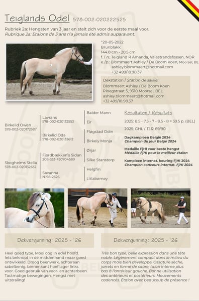 Irina of Stal Valentin is ingeschreven in het Belgisch fjordenpaardenstamboek. Geboortedatum: 08/05/2007 Vader: Kolliståen Moeder: Britny Irina is drachtig van de jonge goedgekeurde hengst Teiglands Odel (zie hengstenfiche en scan tussen de foto’s). Ze is uitgeteld voor half juli. Irina werd tot driemaal toe uitgeroepen tot nationaal kampioen in België. Irina is in orde met ontworming, chip en inentingen. Krijgt regelmatig bezoek van de hoefsmid en loopt momenteel zonder ijzers. Irina heeft een betrouwbaar en zachtaardig karakter. Kan uren stilstaan om vertroeteld te worden, zelfs door de allerkleinsten. Met twee op de rug, schrikparcours … niets is haar te gek. Ze geniet ook van een buitenrit, alleen of in groep. Wordt hier zowel door kinderen als volwassenen gereden. Verder is Irina goed verkeersmak. Irina loopt bij ons 24/7 buiten en beschikt over een loopstal. Gaat gemakkelijk op de trailer en is flink tijdens het transport. Flink bij dierenarts en hoefsmid. Onze dochter maakt de overstap naar een springpony en wij hebben helaas geen tijd en plaats om meerdere paarden te houden.