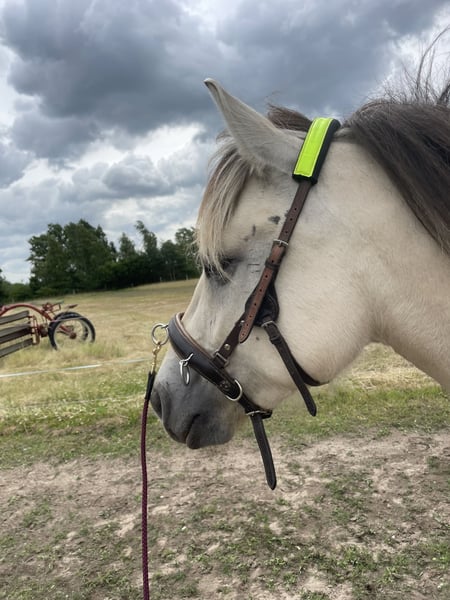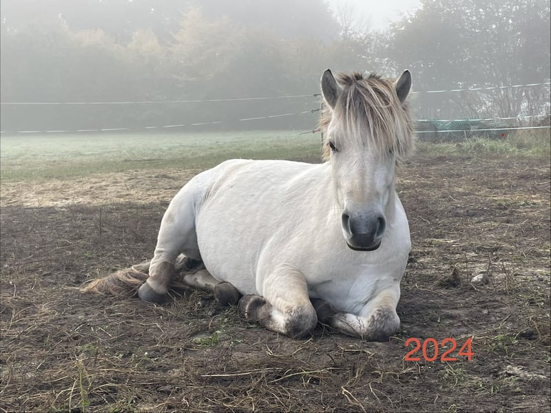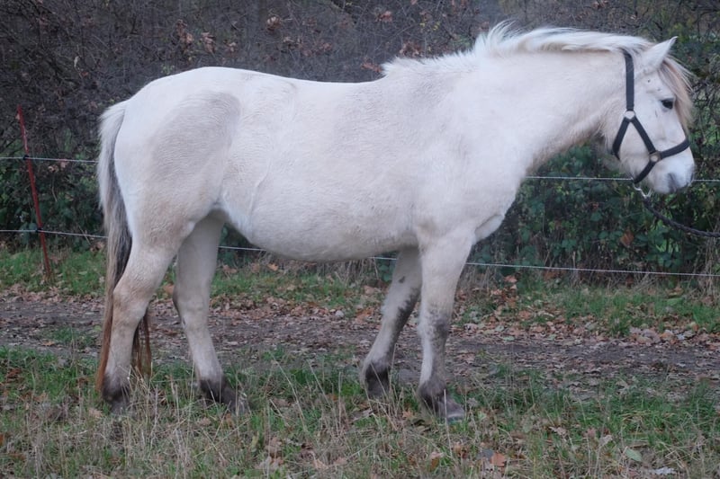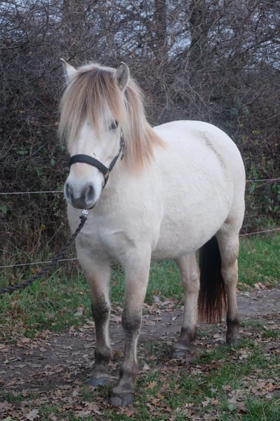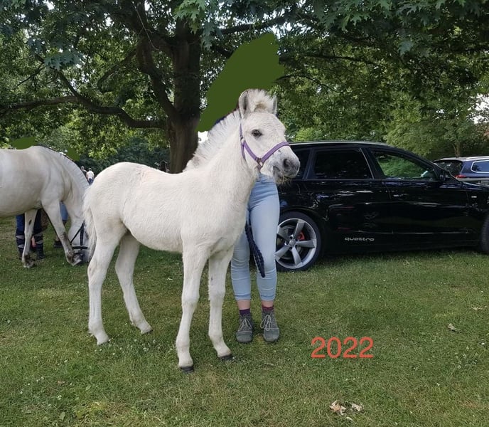 We are selling our self-bred white Fjord mare. Inskar was born and raised on our farm in April 2022, growing up among children, tractors, dogs, and the daily hustle of farm life. She is well accustomed to walks, riding out as a lead horse, ground work, saddling, and harnessing, remaining very calm in all situations. She is extremely affectionate, cuddly, and has a very open, curious, and fearless personality. She won first place at the foal show and comes with full papers; her dam is on-site. Her current height is approximately 143 cm (14.3 hh). We are selling her as a broodmare, as she sustained a leg injury in 2024, which caused an inflammation of her tendon, making her unsuitable for riding. Her teeth, hooves, and deworming are regularly maintained, and a dental passport is available. Please feel free to contact us with any questions or if you're interested.